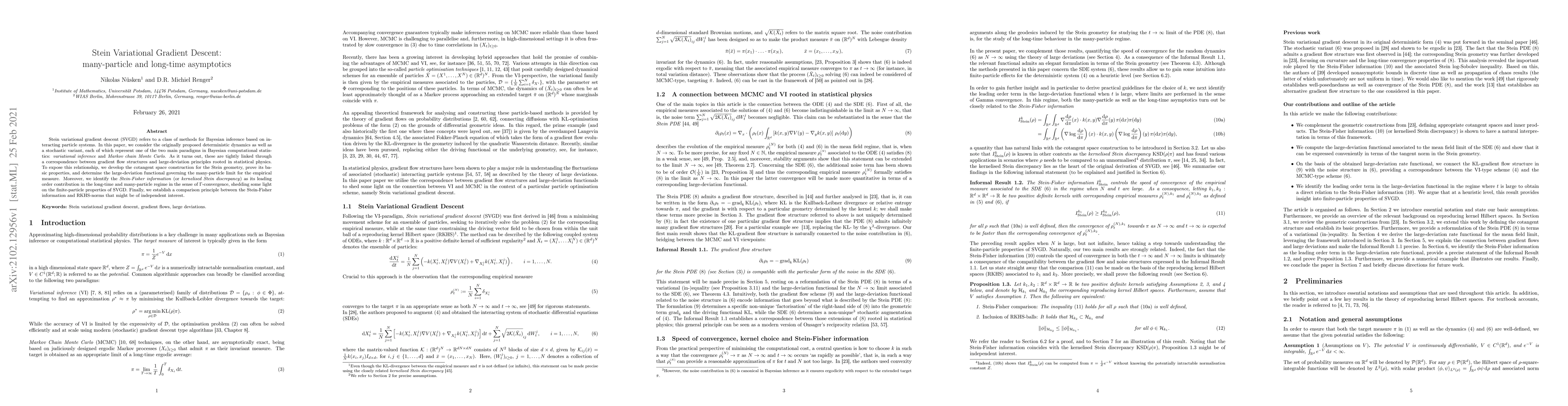 This paper explores the asymptotic behaviors of Stein variational gradient descent (SVGD) in many-particle and long-time limits, revealing connections between variational inference and Markov chain Monte Carlo through gradient flow structures and large-deviation principles. It identifies the Stein-Fisher information as a key factor in these regimes, establishing a comparison principle with RKHS-norms.