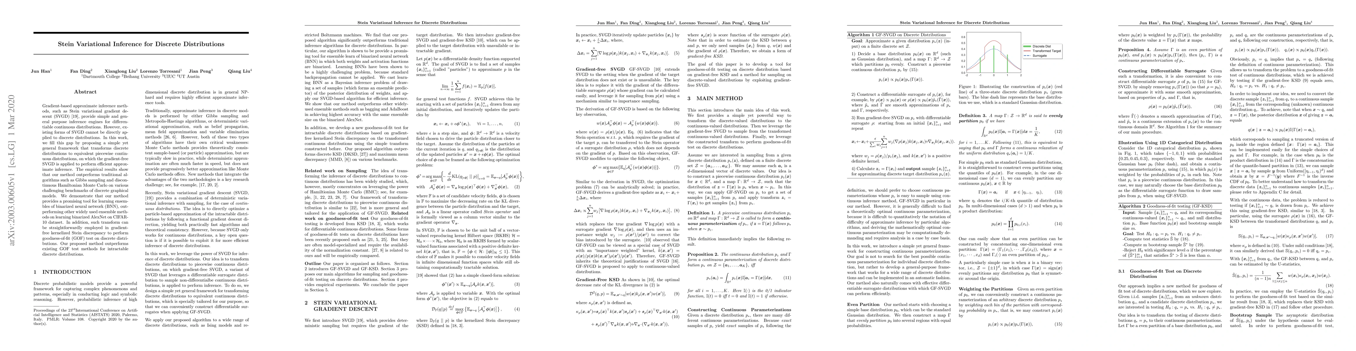 This paper proposes a novel framework to apply Stein Variational Inference (SVGD) to discrete distributions by transforming them into piecewise continuous distributions, achieving better performance than traditional methods like Gibbs sampling and Hamiltonian Monte Carlo. The method also shows superior results in learning binarized neural networks and performing goodness-of-fit tests on discrete distributions.