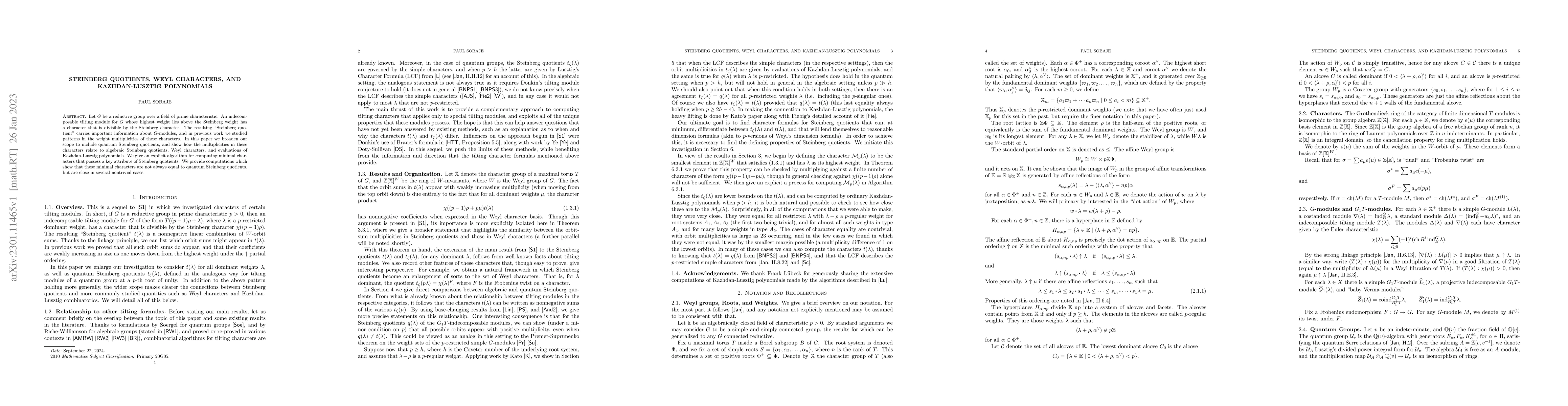 This paper explores the connections between Steinberg quotients, Weyl characters, and Kazhdan-Lusztig polynomials for reductive groups in prime characteristic. It introduces quantum Steinberg quotients and presents an algorithm to compute minimal characters that exhibit key attributes of Steinberg quotients, showing they differ from quantum Steinberg quotients but align closely in several significant cases.