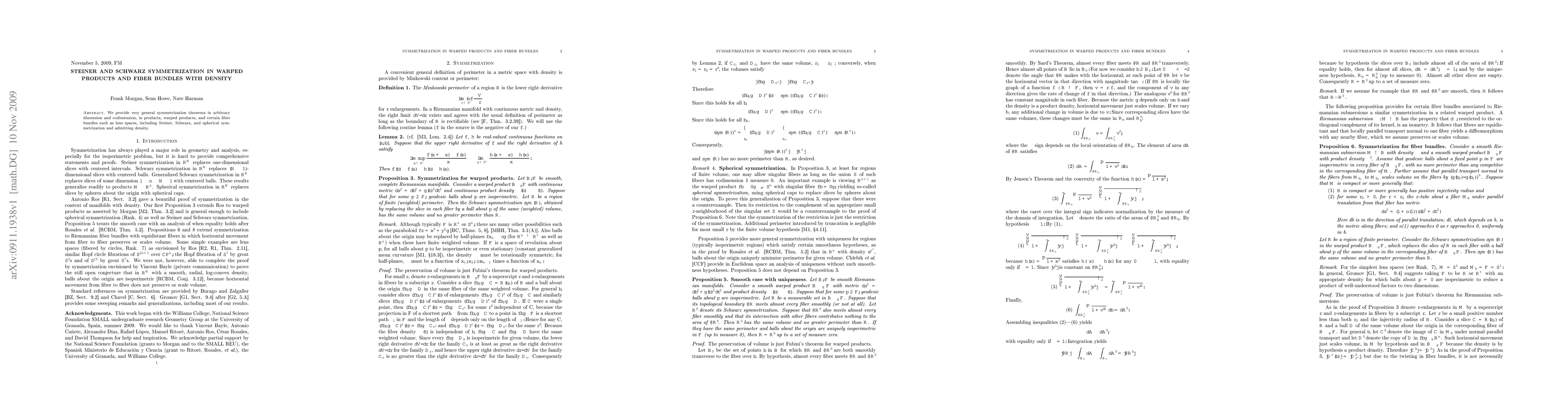 Summary: This paper presents comprehensive symmetrization theorems for Steiner, Schwarz, and spherical symmetrization in various geometric structures, including products, warped products, and fiber bundles like lens spaces, all while accommodating density functions. The results apply to arbitrary dimensions and codimensions.