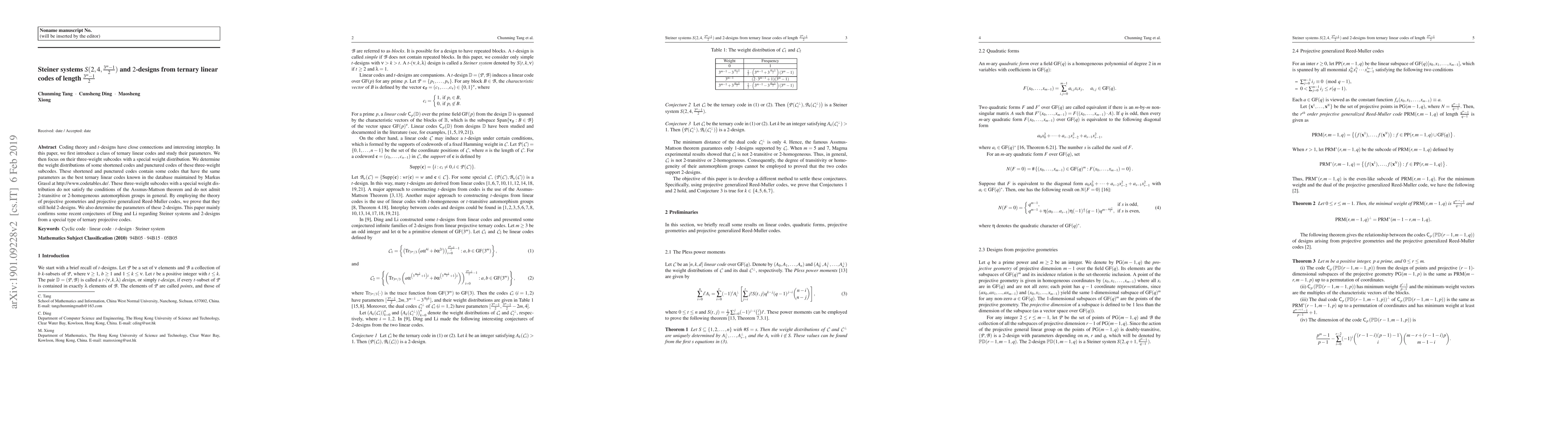 This paper explores ternary linear codes and their three-weight subcodes, determining their weight distributions and proving they yield $2$-designs despite not satisfying Assmus-Mattson conditions. It confirms recent conjectures on Steiner systems and $2$-designs from these special ternary projective codes.