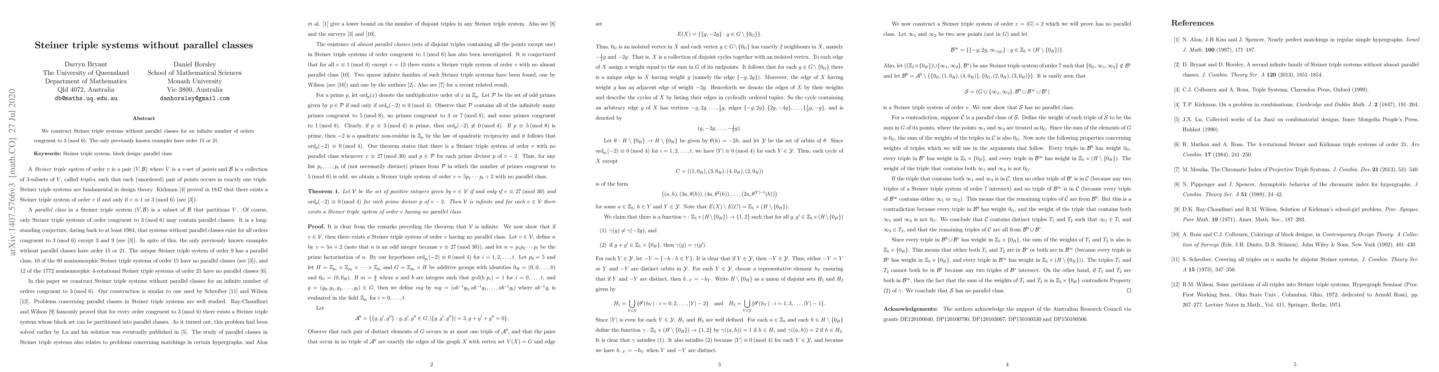 Summary: This paper constructs Steiner triple systems without parallel classes for an infinite number of new orders congruent to $3 \pmod{6}$, expanding beyond the previously known examples of orders $15$ and $21$.