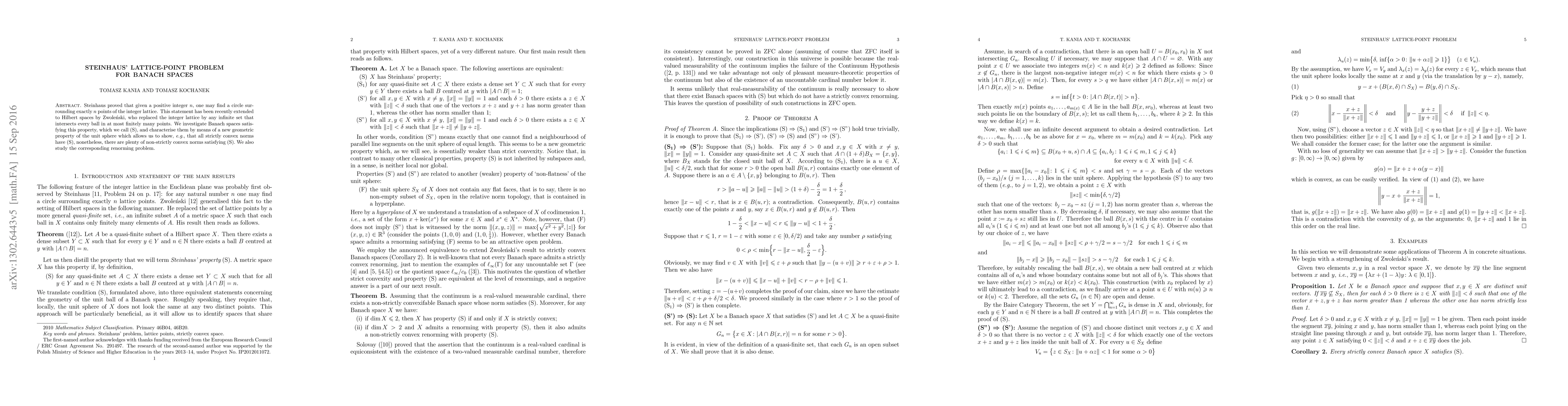 Steinhaus proved that given a~positive integer $n$, one may find a circle surrounding exactly $n$ points of the integer lattice. This statement has been recently extended to Hilbert spaces by Zwole\'{n}ski, who replaced the integer lattice by any infinite set that intersects every ball in at most finitely many points. We investigate Banach spaces satisfying this property, which we call (S), and characterise them by means of a new geometric property of the unit sphere which allows us to show, e.g., that all strictly convex norms have (S), nonetheless, there are plenty of non-strictly convex norms satisfying (S). We also study the corresponding renorming problem.