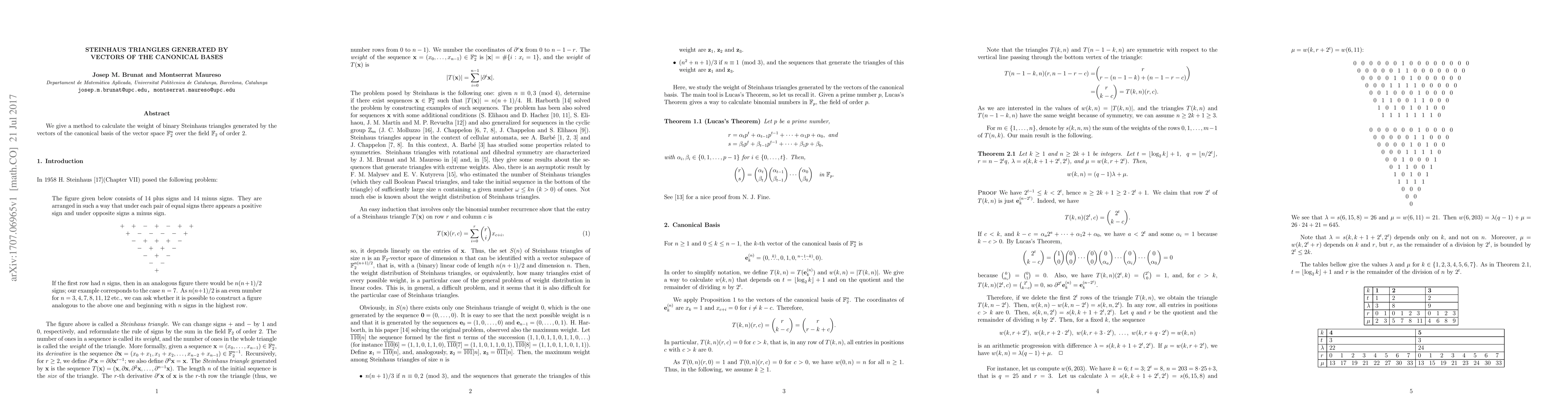 We give a method to calculate the weight of binary Steinhaus triangles generated by the vectors of the canonical basis of the vector space $\mathbb{F}_2^n$ over the field $\mathbb{F}_2$ of order $2$.