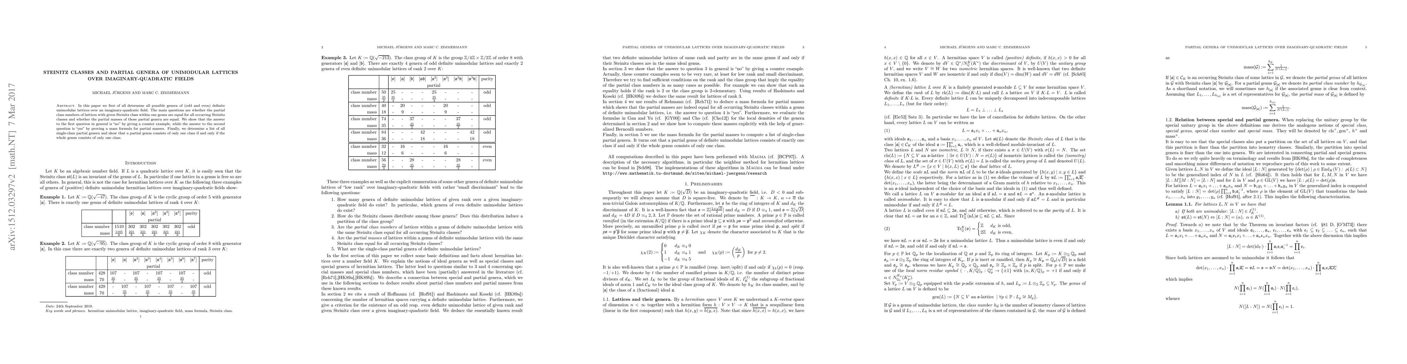 This paper investigates the genera of unimodular lattices over imaginary-quadratic fields, finding that partial class numbers are not universally equal across Steinitz classes but proving a mass formula for partial genera. It concludes that a partial genus contains only one class if the entire genus does so.