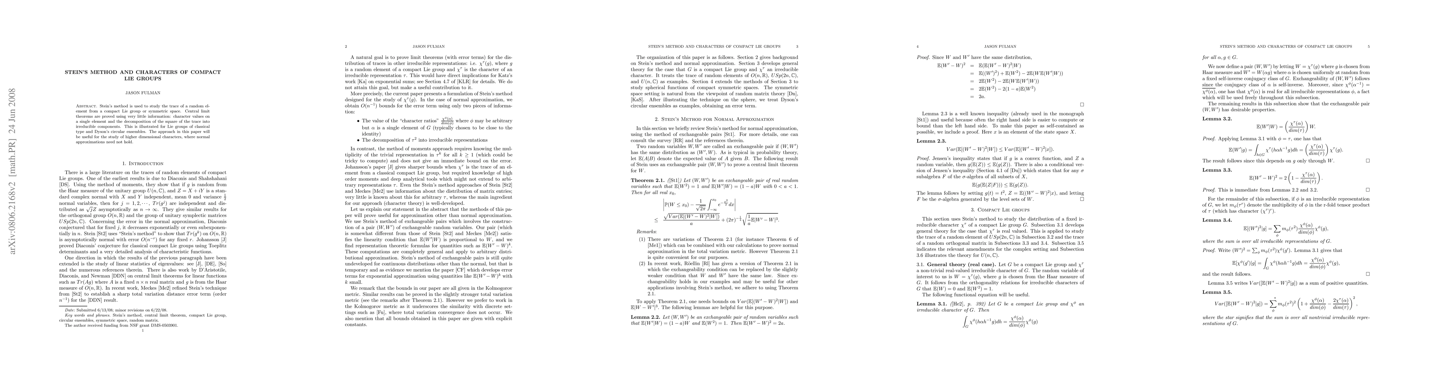 Stein's method is used to study the trace of a random element from compact Lie groups, proving central limit theorems with minimal information about character values and irreducible components.