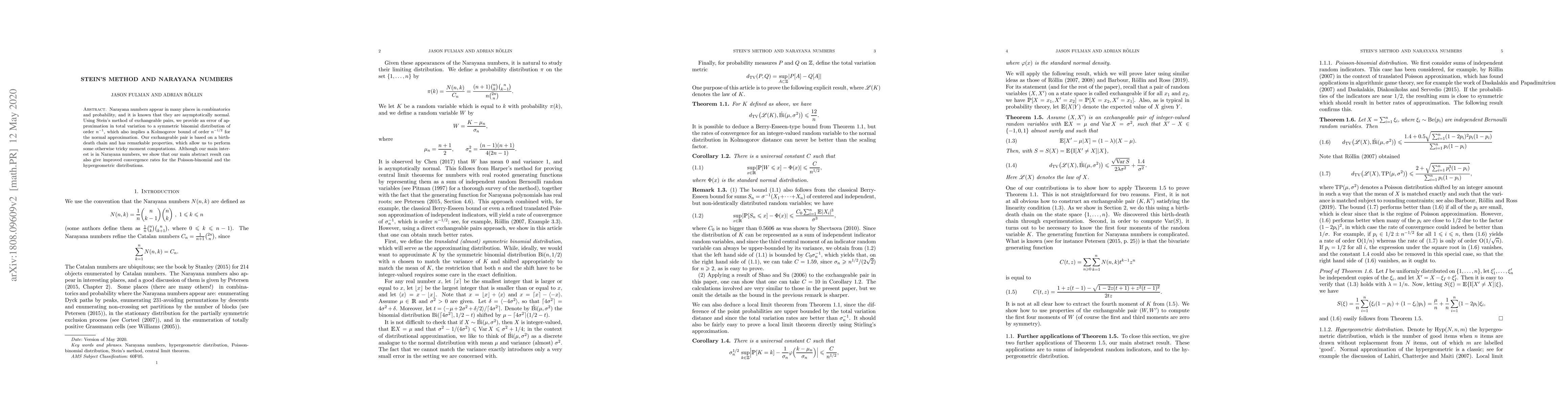 Narayana numbers appear in many places in combinatorics and probability, and it is known that they are asymptotically normal. Using Stein's method of exchangeable pairs, we provide an error of approximation in total variation to a symmetric binomial distribution of order~$n^{-1}$, which also implies a Kolmogorov bound of order~$n^{-1/2}$ for the normal approximation. Our exchangeable pair is based on a birth-death chain and has remarkable properties, which allow us to perform some otherwise tricky moment computations. Although our main interest is in Narayana numbers, we show that our main abstract result can also give improved convergence rates for the Poisson-binomial and the hypergeometric distributions.