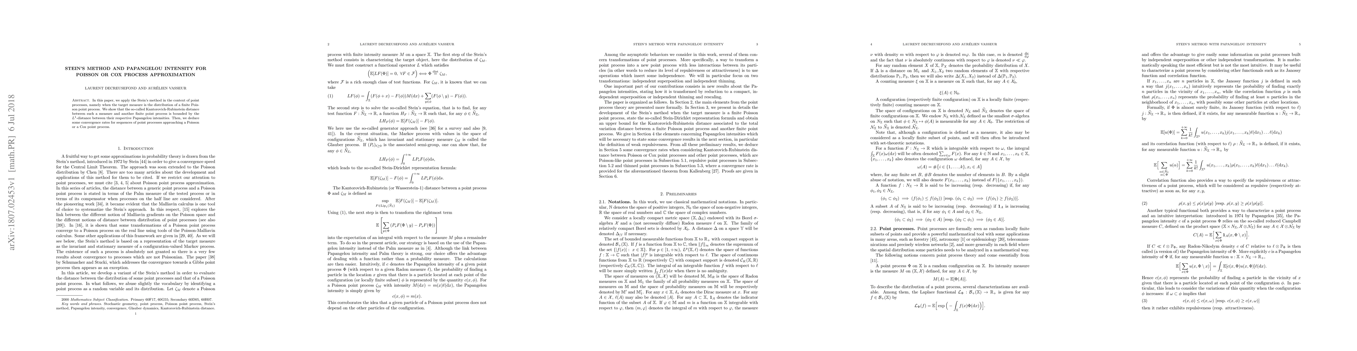 This paper utilizes Stein's method to approximate finite Poisson and Cox point processes, demonstrating that the Kantorovich-Rubinstein distance between these processes is bounded by the $L^1$-distance of their Papangelou intensities, and derives convergence rates for sequences approaching these target processes.