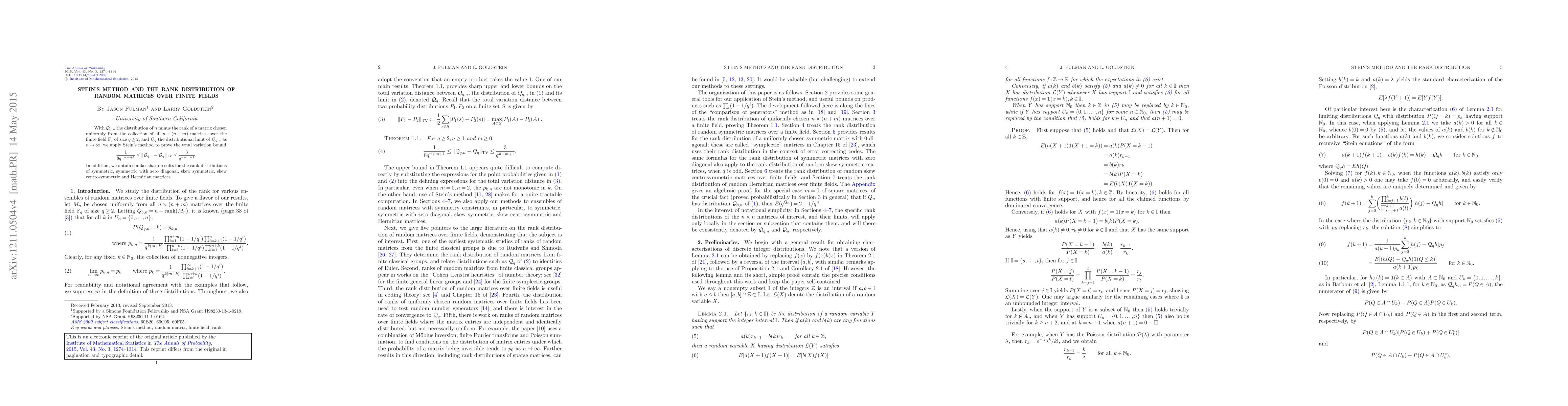 This paper uses Stein's method to analyze the rank distribution of random matrices over finite fields, proving a total variation bound for the difference between the rank distribution of large matrices and its limiting distribution. It also extends these results to specific types of matrices, including symmetric, skew symmetric, and Hermitian matrices.