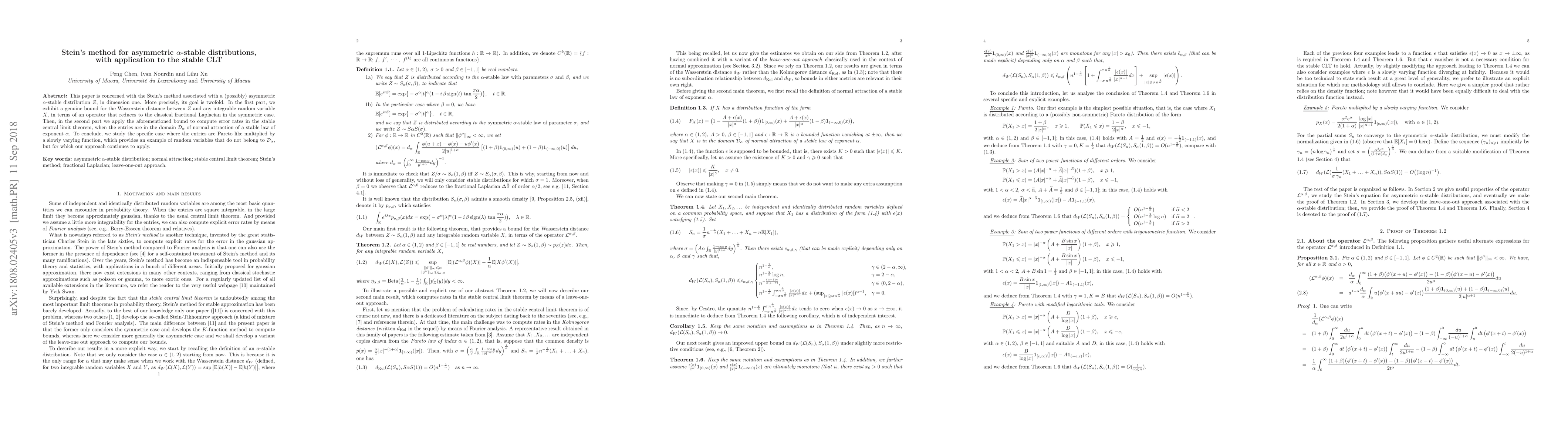This paper applies Stein's method to asymmetric alpha-stable distributions, establishing a bound for the Wasserstein distance between these distributions and any integrable random variable. It then uses this bound to compute error rates in the stable central limit theorem, with implications for normal attraction of stable laws.