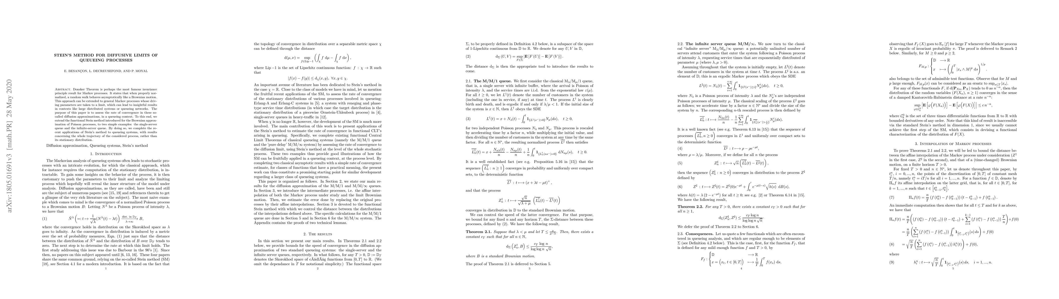 This paper extends Stein's method to assess the rate of convergence in diffusion approximations of queueing processes, specifically single-server and infinite-server queues. It builds upon recent applications of Stein's method, providing results for entire process trajectories rather than stationary distributions.