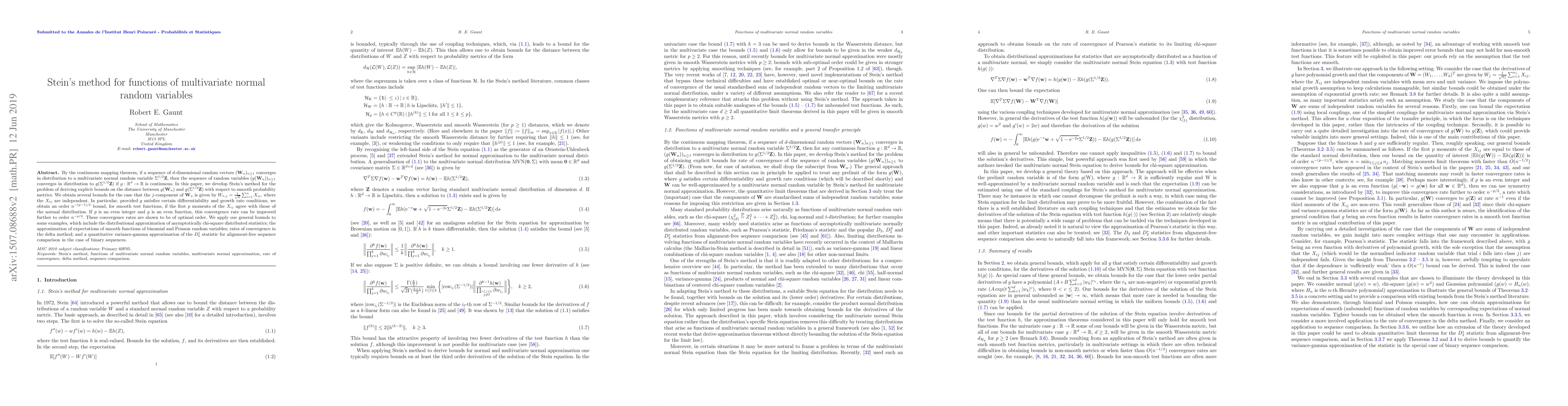 This paper develops Stein's method to derive explicit bounds for the distance between functions of multivariate normal random variables and their approximations, achieving optimal convergence rates based on differentiability and moment conditions. It applies these bounds to several statistical examples, including chi-square approximations and convergence rates in the delta method.