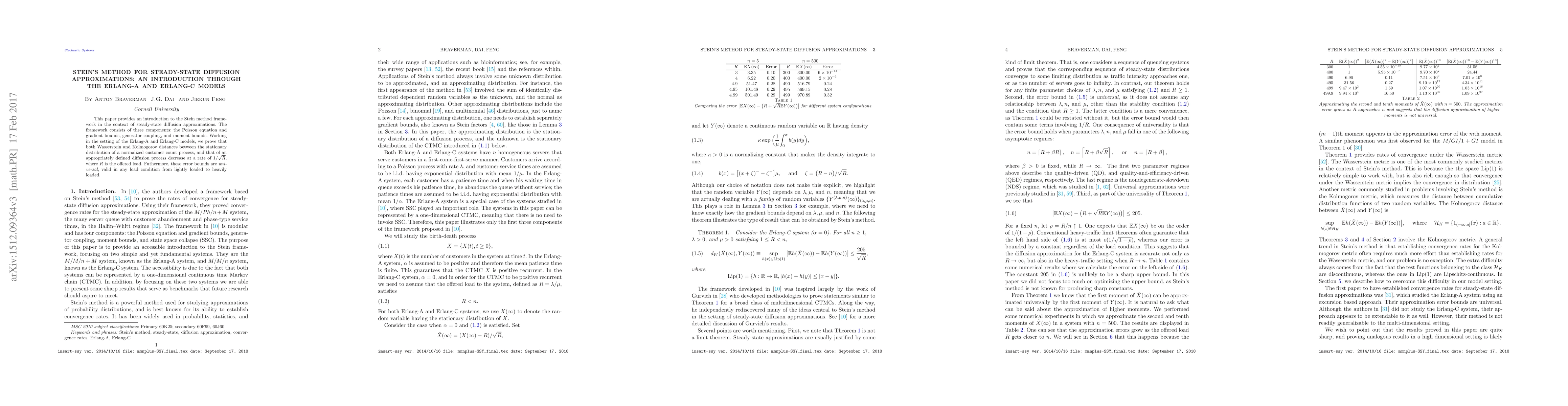 This paper provides an introduction to the Stein method framework in the context of steady-state diffusion approximations. The framework consists of three components: the Poisson equation and gradient bounds, generator coupling, and moment bounds. Working in the setting of the Erlang-A and Erlang-C models, we prove that both Wasserstein and Kolmogorov distances between the stationary distribution of a normalized customer count process, and that of an appropriately defined diffusion process decrease at a rate of $1/\sqrt{R}$, where $R$ is the offered load. Futhermore, these error bounds are \emph{universal}, valid in any load condition from lightly loaded to heavily loaded.