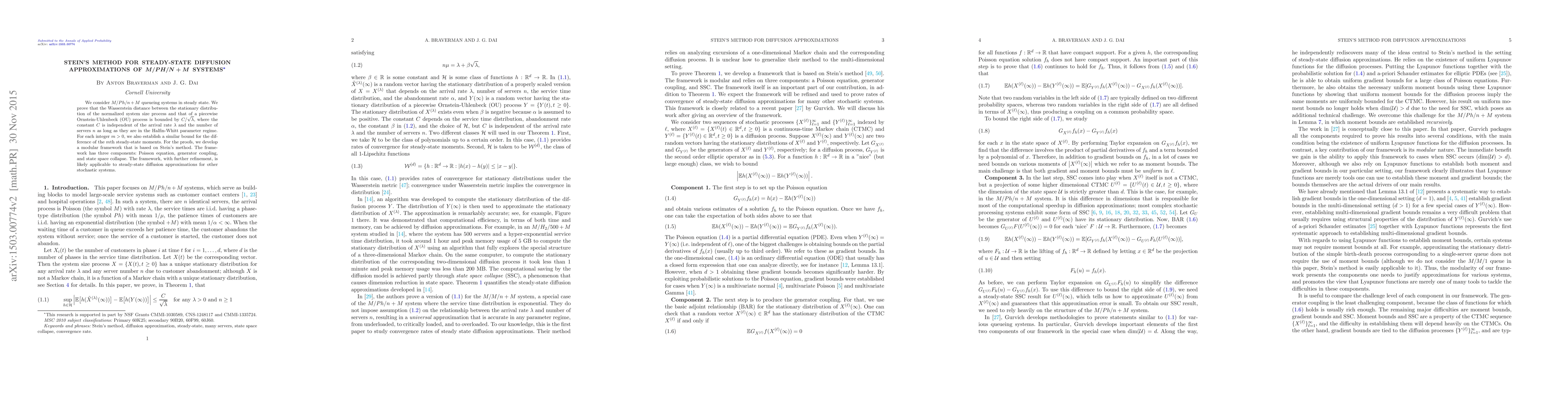 We consider $M/Ph/n+M$ queueing systems in steady state. We prove that the Wasserstein distance between the stationary distribution of the normalized system size process and that of a piecewise Ornstein-Uhlenbeck (OU) process is bounded by $C/\sqrt{\lambda}$, where the constant $C$ is independent of the arrival rate $\lambda$ and the number of servers $n$ as long as they are in the Halfin-Whitt parameter regime. For each integer $m>0$, we also establish a similar bound for the difference of the $m$th steady-state moments. For the proofs, we develop a modular framework that is based on Stein's method. The framework has three components: Poisson equation, generator coupling, and state space collapse. The framework, with further refinement, is likely applicable to steady-state diffusion approximations for other stochastic systems.