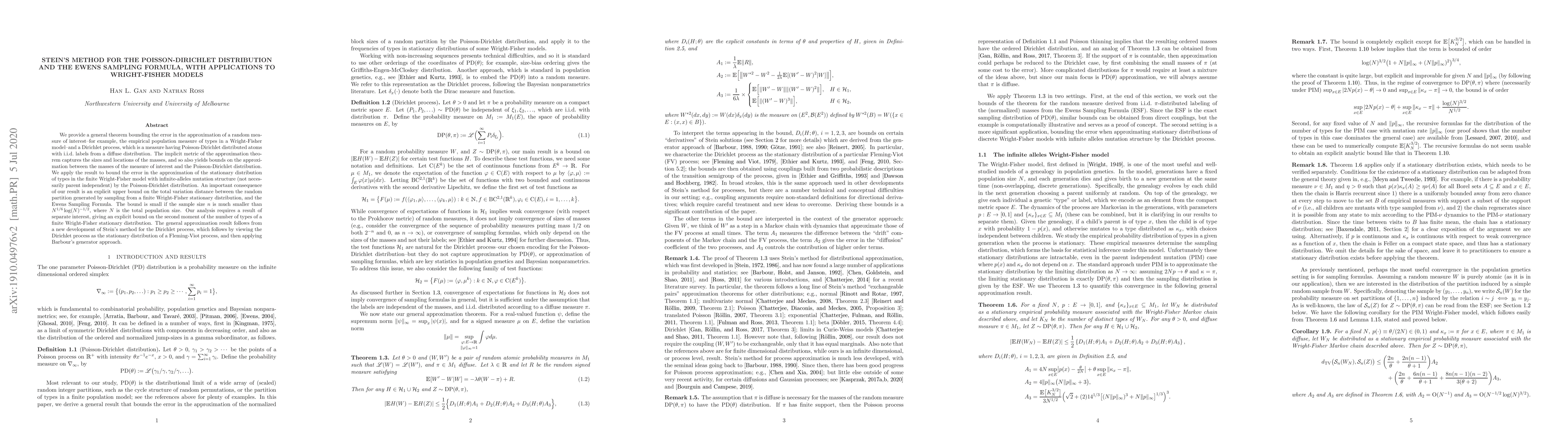 We provide a general theorem bounding the error in the approximation of a random measure of interest--for example, the empirical population measure of types in a Wright-Fisher model--and a Dirichlet process, which is a measure having Poisson-Dirichlet distributed atoms with i.i.d. labels from a diffuse distribution. The implicit metric of the approximation theorem captures the sizes and locations of the masses, and so also yields bounds on the approximation between the masses of the measure of interest and the Poisson-Dirichlet distribution. We apply the result to bound the error in the approximation of the stationary distribution of types in the finite Wright-Fisher model with infinite-alleles mutation structure (not necessarily parent independent) by the Poisson-Dirichlet distribution. An important consequence of our result is an explicit upper bound on the total variation distance between the random partition generated by sampling from a finite Wright-Fisher stationary distribution, and the Ewens Sampling Formula. The bound is small if the sample size $n$ is much smaller than $N^{1/6}\log(N)^{-1/2}$, where $N$ is the total population size. Our analysis requires a result of separate interest, giving an explicit bound on the second moment of the number of types of a finite Wright-Fisher stationary distribution. The general approximation result follows from a new development of Stein's method for the Dirichlet process, which follows by viewing the Dirichlet process as the stationary distribution of a Fleming-Viot process, and then applying Barbour's generator approach.