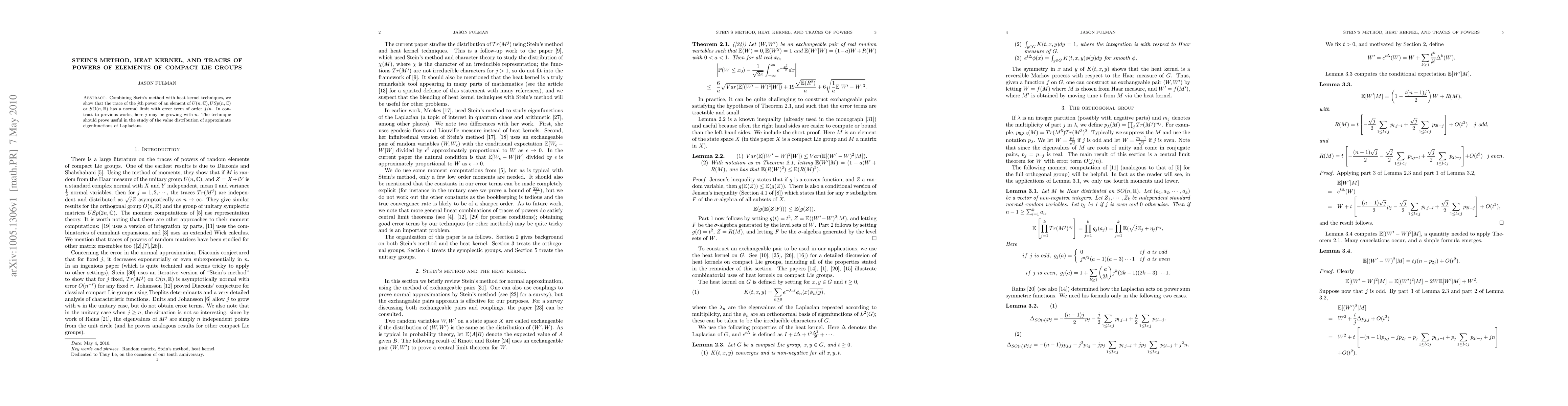 This research uses Stein's method and heat kernel techniques to analyze the limit of powers of elements in compact Lie groups, showing that the jth power has a normal limit with an error term of order j/n.