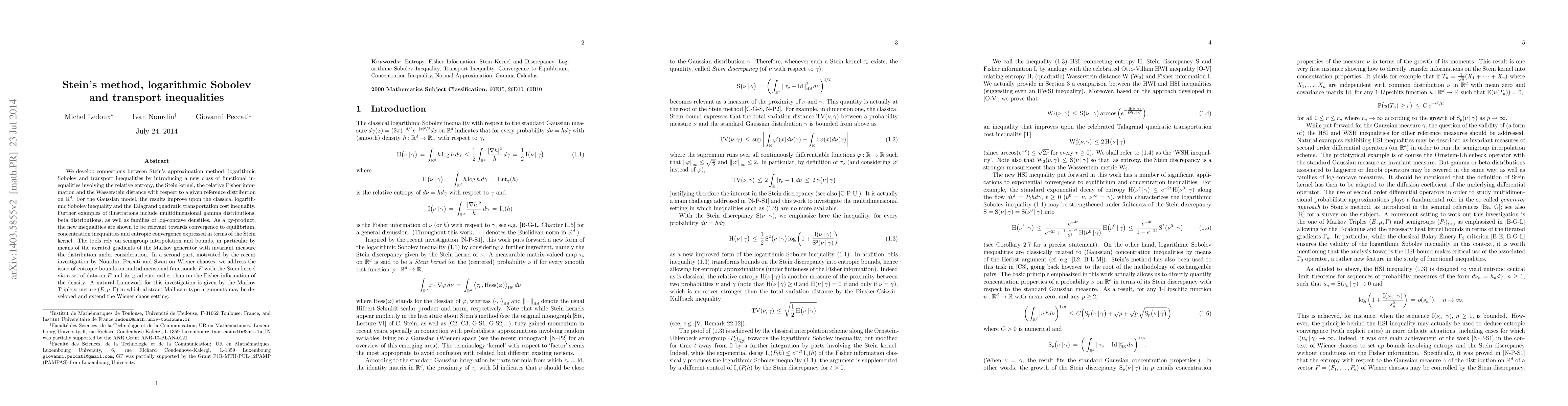 We develop connections between Stein's approximation method, logarithmic Sobolev and transport inequalities by introducing a new class of functional inequalities involving the relative entropy, the Stein kernel, the relative Fisher information and the Wasserstein distance with respect to a given reference distribution on $\mathbb{R}^d$. For the Gaussian model, the results improve upon the classical logarithmic Sobolev inequality and the Talagrand quadratic transportation cost inequality. Further examples of illustrations include multidimensional gamma distributions, beta distributions, as well as families of log-concave densities. As a by-product, the new inequalities are shown to be relevant towards convergence to equilibrium, concentration inequalities and entropic convergence expressed in terms of the Stein kernel. The tools rely on semigroup interpolation and bounds, in particular by means of the iterated gradients of the Markov generator with invariant measure the distribution under consideration. In a second part, motivated by the recent investigation by Nourdin, Peccati and Swan on Wiener chaoses, we address the issue of entropic bounds on multidimensional functionals $F$ with the Stein kernel via a set of data on $F$ and its gradients rather than on the Fisher information of the density. A natural framework for this investigation is given by the Markov Triple structure $(E, \mu, \Gamma)$ in which abstract Malliavin-type arguments may be developed and extend the Wiener chaos setting.