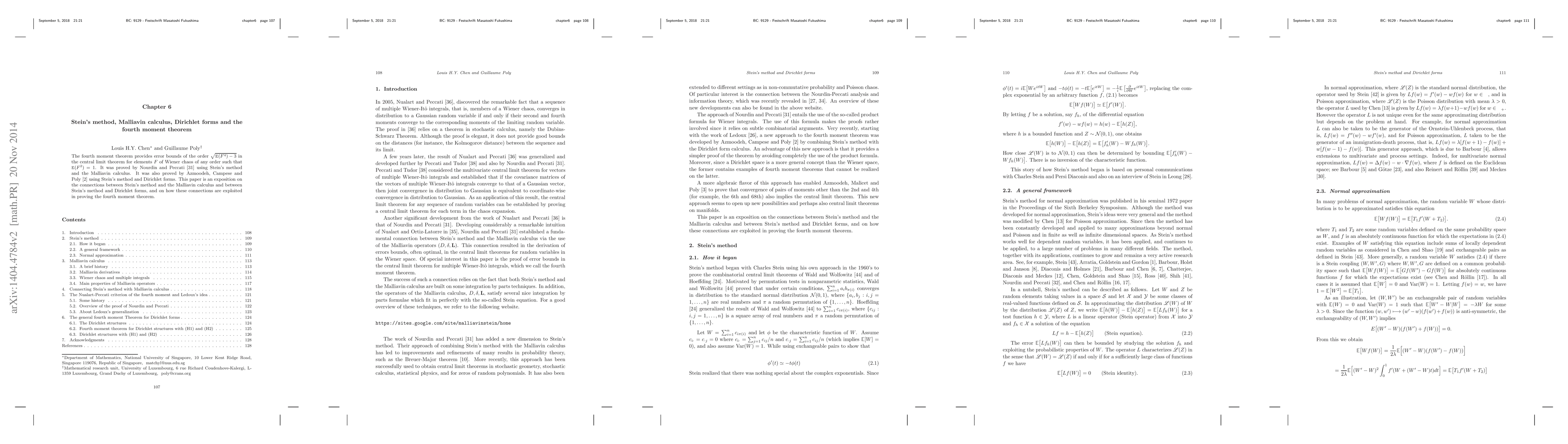 This paper explores the interplay between Stein's method, Malliavin calculus, and Dirichlet forms, focusing on their applications in proving the fourth moment theorem, which provides central limit theorem error bounds for Wiener chaos elements with unit variance.