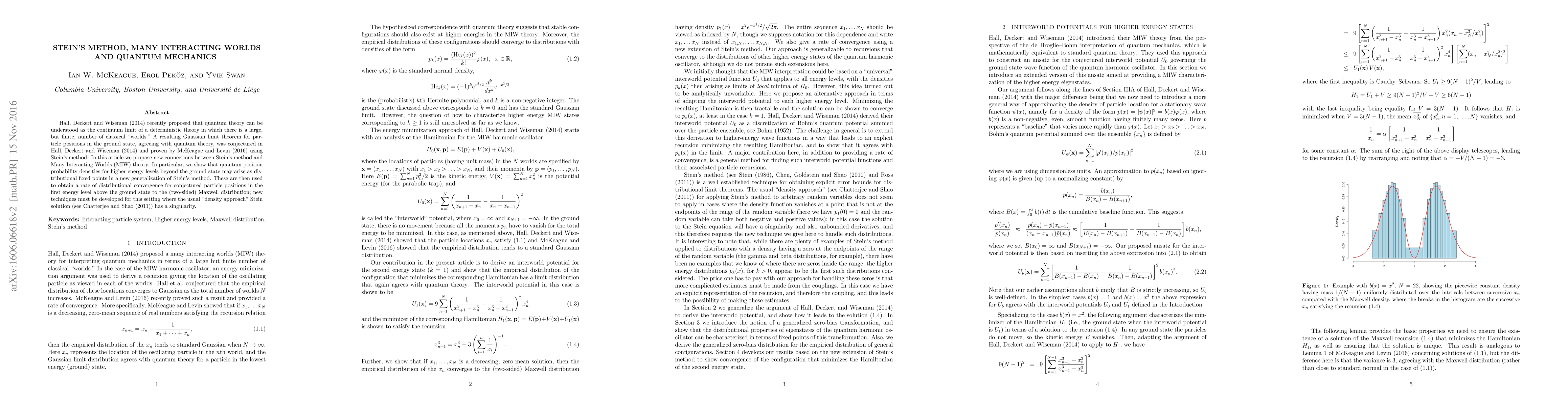 This paper explores the connections between Stein's method and Many Interacting Worlds (MIW) theory, demonstrating that quantum position probability densities for higher energy levels emerge from a generalized Stein's method. The authors develop new techniques to achieve a rate of distributional convergence for particle positions in the first energy level above the ground state to the Maxwell distribution.