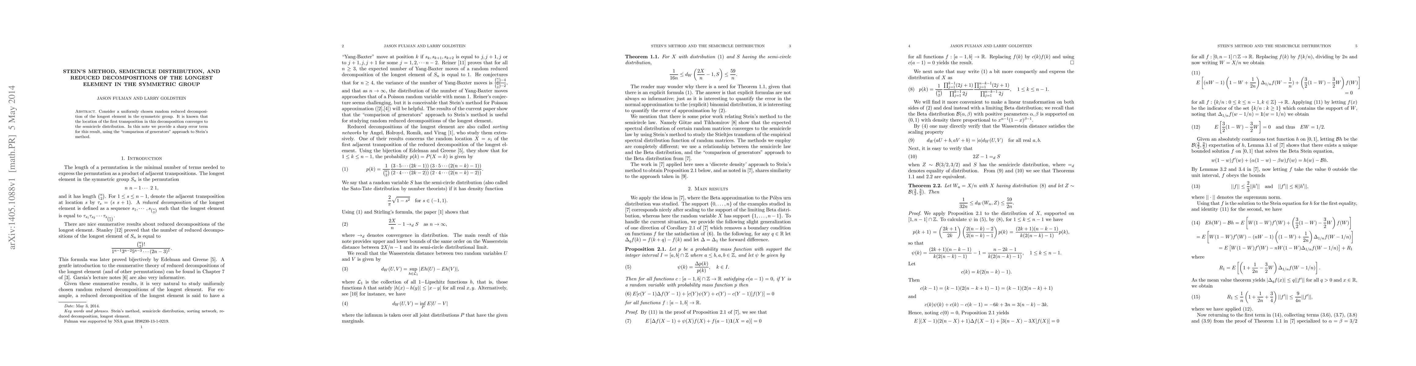 Consider a uniformly chosen random reduced decomposition of the longest element in the symmetric group. It is known that the location of the first transposition in this decomposition converges to the semicircle distribution. In this note we provide a sharp error term for this result, using the "comparison of generators" approach to Stein's method.