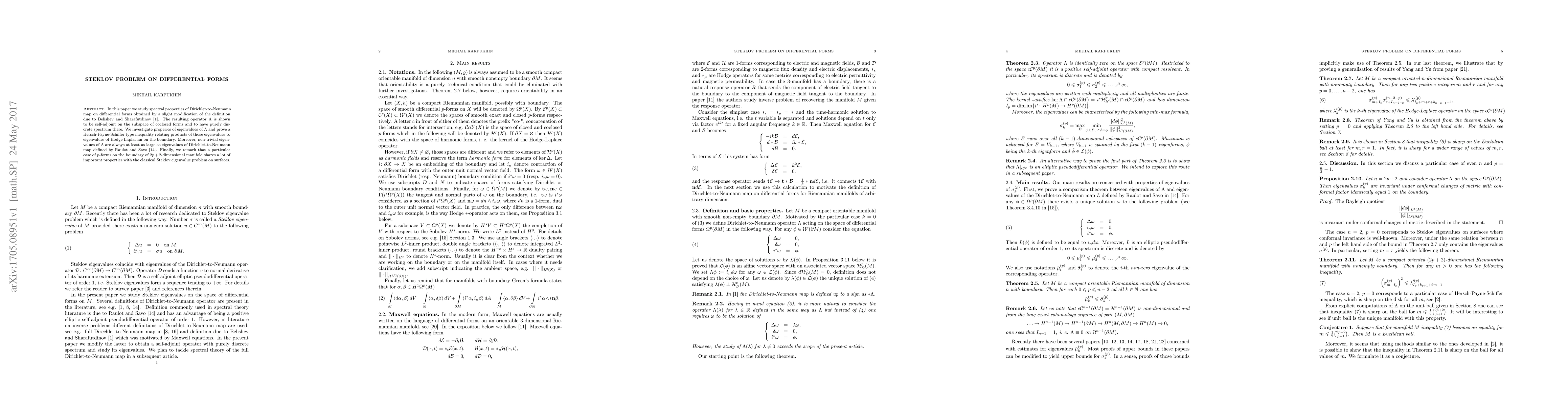In this paper we study spectral properties of Dirichlet-to-Neumann map on differential forms obtained by a slight modification of the definition due to Belishev and Sharafutdinov. The resulting operator $\Lambda$ is shown to be self-adjoint on the subspace of coclosed forms and to have purely discrete spectrum there.We investigate properies of eigenvalues of $\Lambda$ and prove a Hersch-Payne-Schiffer type inequality relating products of those eigenvalues to eigenvalues of Hodge Laplacian on the boundary. Moreover, non-trivial eigenvalues of $\Lambda$ are always at least as large as eigenvalues of Dirichlet-to-Neumann map defined by Raulot and Savo. Finally, we remark that a particular case of $p$-forms on the boundary of $2p+2$-dimensional manifold shares a lot of important properties with the classical Steklov eigenvalue problem on surfaces.
