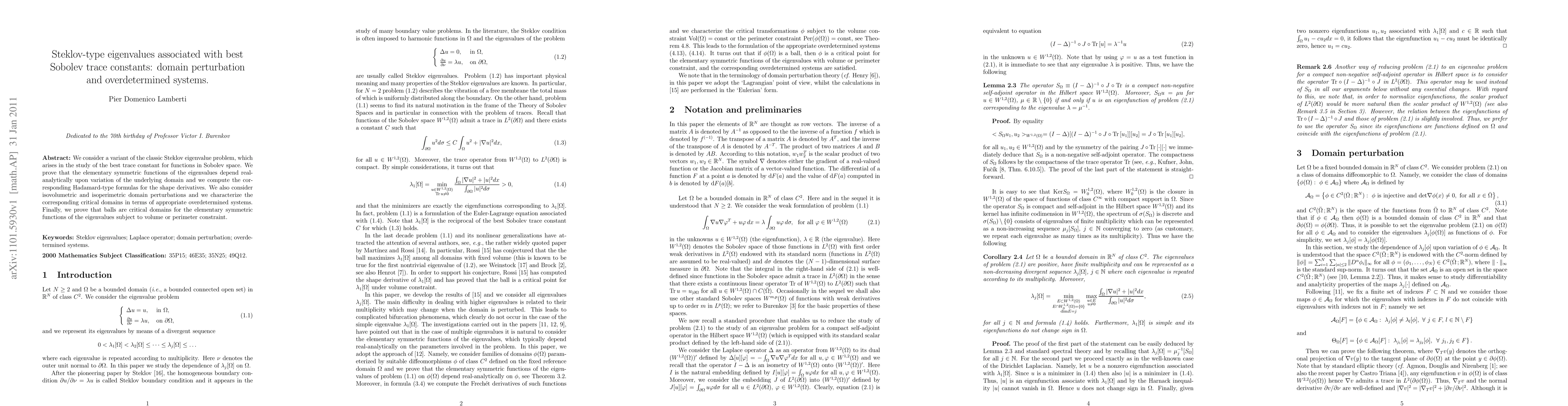 We consider a variant of the classic Steklov eigenvalue problem, which arises in the study of the best trace constant for functions in Sobolev space. We prove that the elementary symmetric functions of the eigenvalues depend real-analytically upon variation of the underlying domain and we compute the corresponding Hadamard-type formulas for the shape derivatives. We also consider isovolumetric and isoperimetric domain perturbations and we characterize the corresponding critical domains in terms of appropriate overdetermined systems. Finally, we prove that balls are critical domains for the elementary symmetric functions of the eigenvalues subject to volume or perimeter constraint.