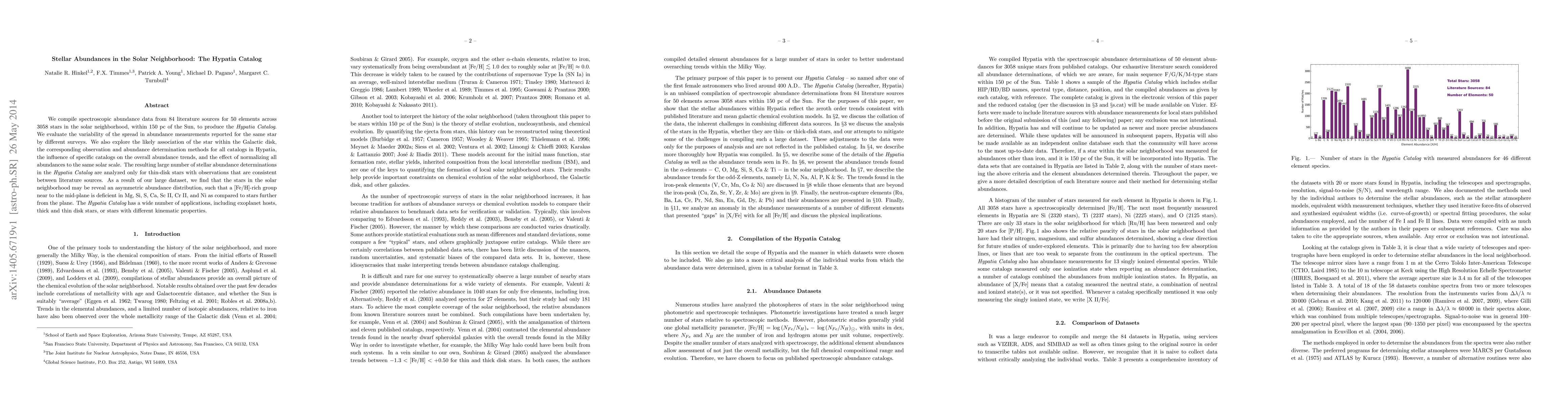 The Hypatia Catalog compiles spectroscopic abundance data for 50 elements across 3058 stars within 150 pc of the Sun, revealing an asymmetric abundance distribution with a [Fe/H]-rich group deficient in several elements compared to those further from the Galactic plane. This extensive dataset has diverse applications for studying exoplanet hosts and different stellar populations.
