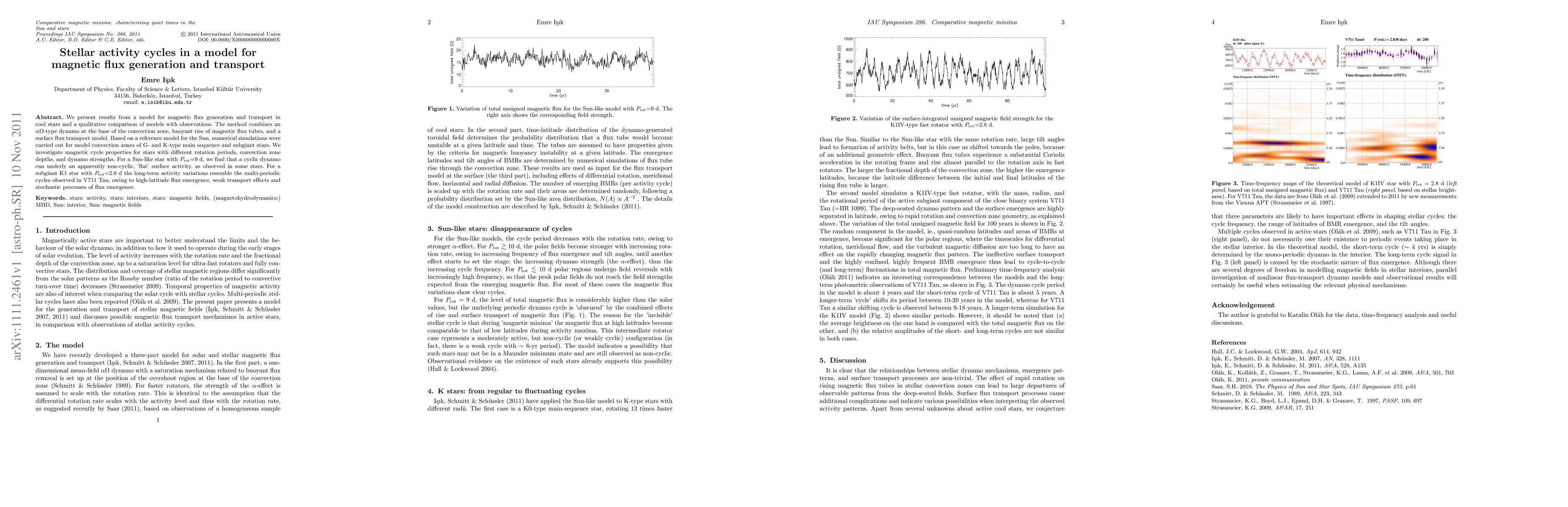 This paper models magnetic flux generation and transport in cool stars, combining dynamo theory with flux tube dynamics and surface transport. It finds that cyclic dynamos can produce non-cyclic surface activity and that multi-periodic cycles in subgiant stars result from high-latitude flux emergence and stochastic processes.