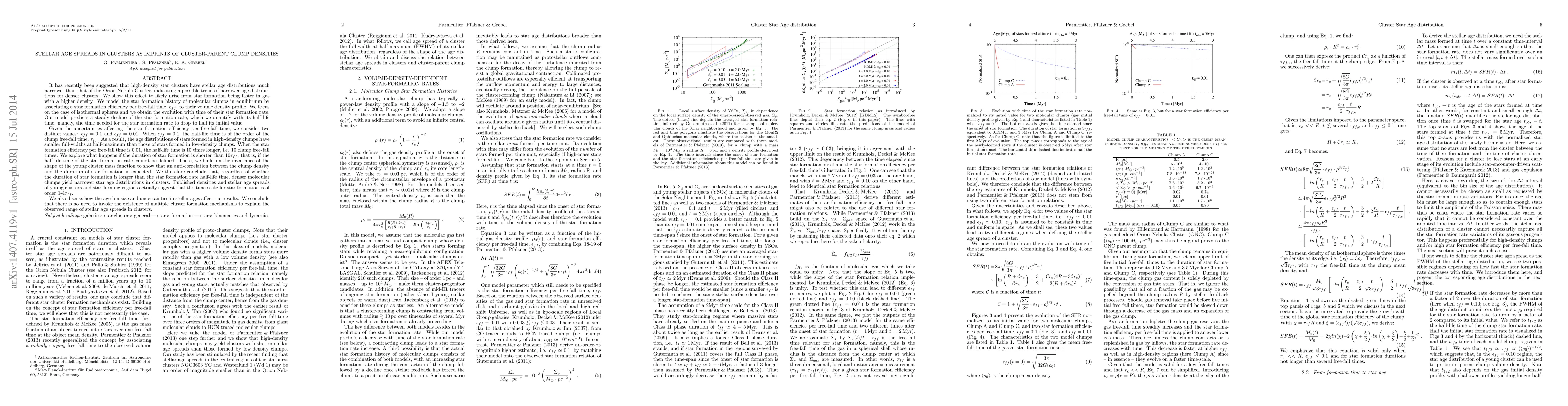 This paper investigates how stellar age distributions in clusters correlate with the density of their parent molecular clumps, finding that higher-density clumps lead to narrower age distributions due to faster star formation. The study models star formation efficiency and concludes that denser clumps result in shorter star formation durations, explaining observed stellar age spreads without requiring multiple cluster formation mechanisms.