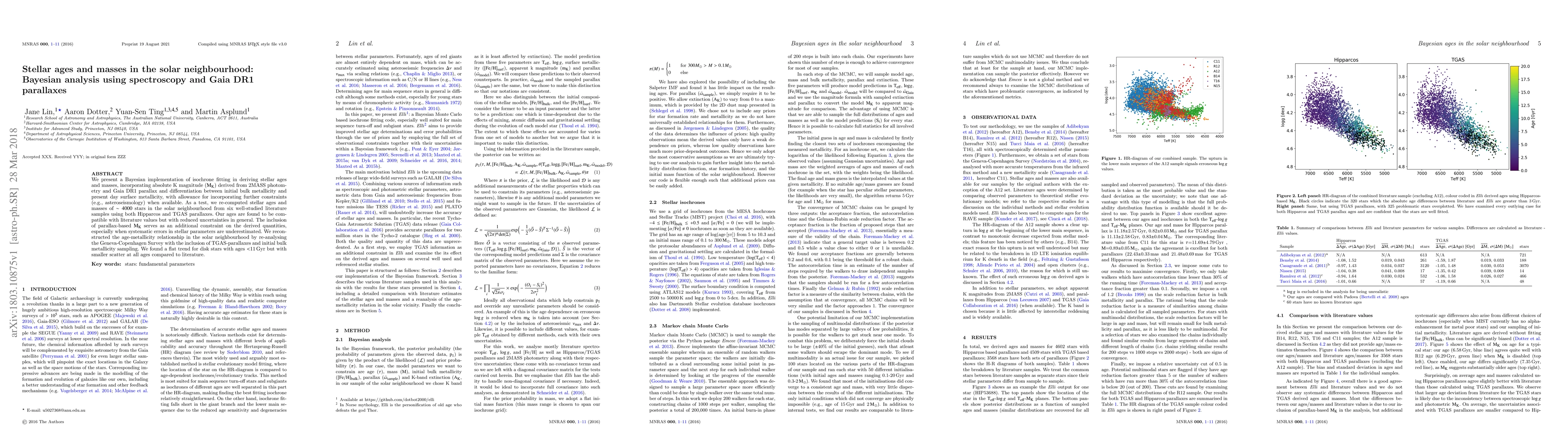 This paper uses a Bayesian approach to derive stellar ages and masses in the solar neighbourhood, incorporating Gaia DR1 parallaxes and 2MASS photometry. The method shows reduced uncertainties compared to literature values and reveals a flatter age-metallicity relationship for disk stars under 11 Gyr.