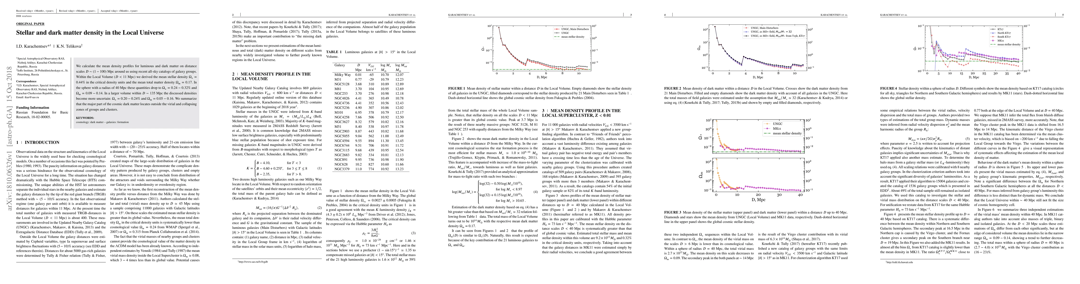 We calculate the mean density profiles for luminous and dark matter on distance scales $D \sim(1 - 100)$ Mpc around us using recent all-sky catalogs of galaxy groups. Within the Local Volume $( D < 11 ~\rm Mpc)$ we derived the mean stellar density $\Omega_*= 0.44\%$ in the critical density units and the mean total matter density $\Omega_m = 0.17$. In the sphere with a radius of 40 Mpc these quantities drop to $\Omega_* = 0.24 - 0.32\%$ and $\Omega_m = 0.09 - 0.14$. In a larger volume within $D\sim135$ Mpc the discussed densities become more uncertain: $\Omega_* = 0.20 - 0.24\%$ and $\Omega_m = 0.05 - 0.16$. We summarize that the major part of the cosmic dark matter locates outside the virial and collapsing zones of groups and clusters.