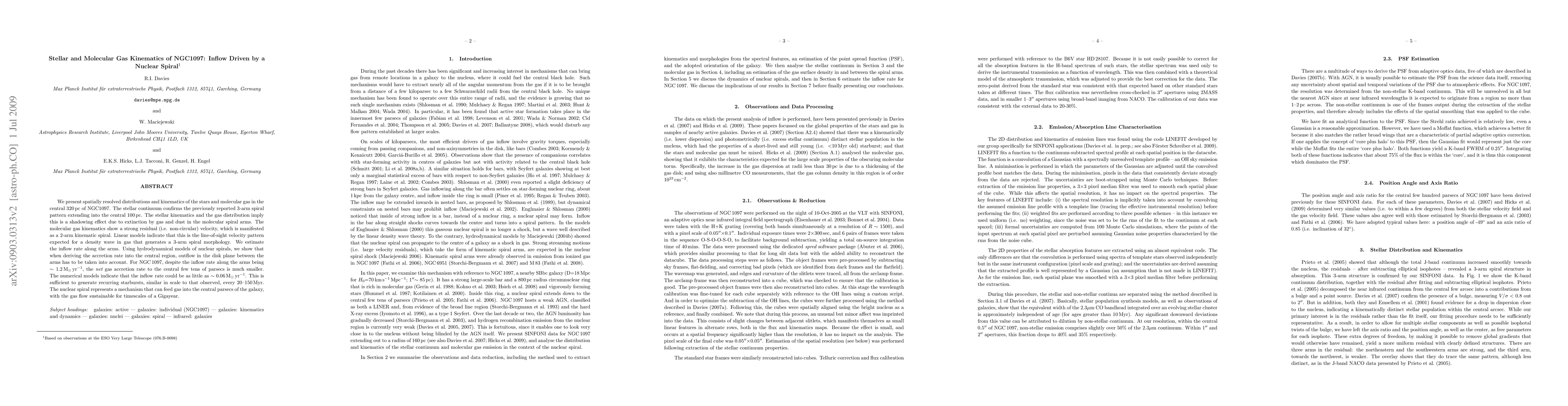 We present spatially resolved distributions and kinematics of the stars and molecular gas in the central 320pc of NGC1097. The stellar continuum confirms the previously reported 3-arm spiral pattern extending into the central 100pc. The stellar kinematics and the gas distribution imply this is a shadowing effect due to extinction by gas and dust in the molecular spiral arms. The molecular gas kinematics show a strong residual (i.e. non-circular) velocity, which is manifested as a 2-arm kinematic spiral. Linear models indicate that this is the line-of-sight velocity pattern expected for a density wave in gas that generates a 3-arm spiral morphology. We estimate the inflow rate along the arms. Using hydrodynamical models of nuclear spirals, we show that when deriving the accretion rate into the central region, outflow in the disk plane between the arms has to be taken into account. For NGC1097, despite the inflow rate along the arms being ~1.2Msun/yr, the net gas accretion rate to the central few tens of parsecs is much smaller. The numerical models indicate that the inflow rate could be as little as ~0.06Msun/yr. This is sufficient to generate recurring starbursts, similar in scale to that observed, every 20-150Myr. The nuclear spiral represents a mechanism that can feed gas into the central parsecs of the galaxy, with the gas flow sustainable for timescales of a Gigayear.