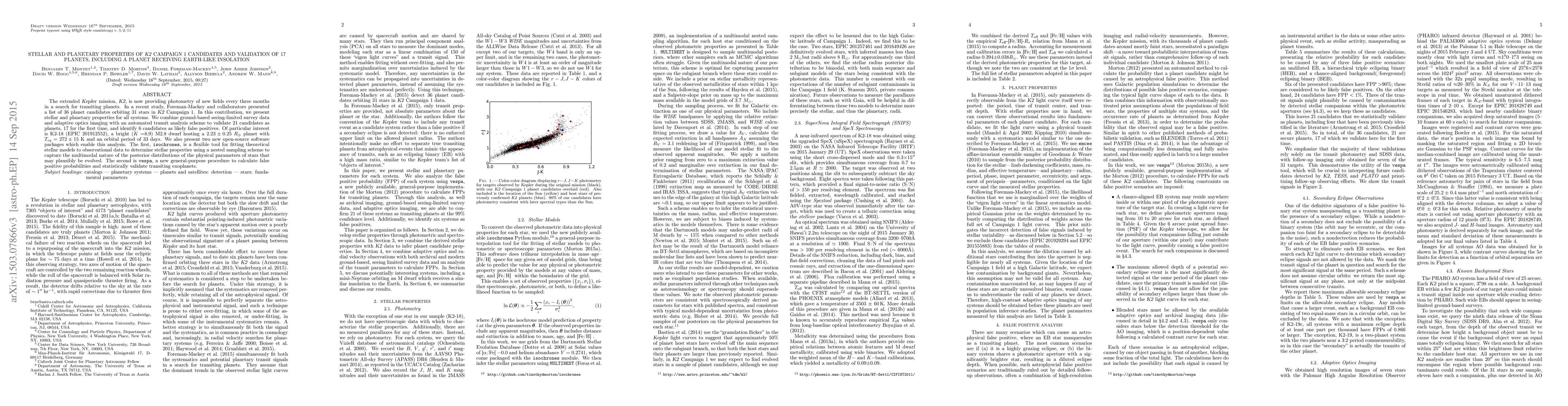 The extended Kepler mission, K2, is now providing photometry of new fields every three months in a search for transiting planets. In a recent study, Foreman-Mackey and collaborators presented a list of 36 planet candidates orbiting 31 stars in K2 Campaign 1. In this contribution, we present stellar and planetary properties for all systems. We combine ground-based seeing-limited survey data and adaptive optics imaging with an automated transit analysis scheme to validate 21 candidates as planets, 17 for the first time, and identify 6 candidates as likely false positives. Of particular interest is K2-18 (EPIC 201912552), a bright (K=8.9) M2.8 dwarf hosting a 2.23 \pm 0.25 R_Earth planet with T_eq = 272 \pm 15 K and an orbital period of 33 days. We also present two new open-source software packages which enable this analysis. The first, isochrones, is a flexible tool for fitting theoretical stellar models to observational data to determine stellar properties using a nested sampling scheme to capture the multimodal nature of the posterior distributions of the physical parameters of stars that may plausibly be evolved. The second is vespa, a new general-purpose procedure to calculate false positive probabilities and statistically validate transiting exoplanets.