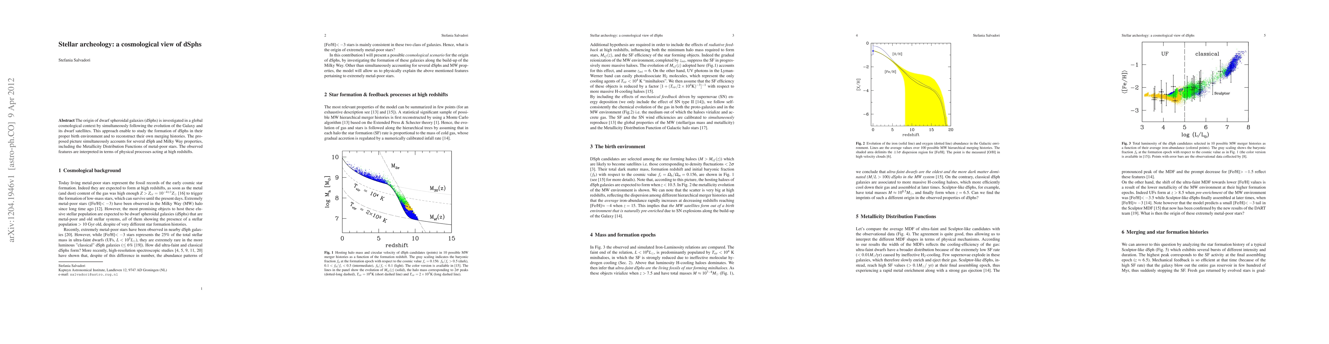 The origin of dwarf spheroidal galaxies (dSphs) is investigated in a global cosmological context by simultaneously following the evolution of the Milky Way Galaxy and its dwarf satellites. This approach enable to study the formation of dSphs in their proper birth environment and to reconstruct their own merging histories. The proposed picture simultaneously accounts for several dSph and Milky Way properties, including the Metallicity Distribution Functions of metal-poor stars. The observed features are interpreted in terms of physical processes acting at high redshifts.