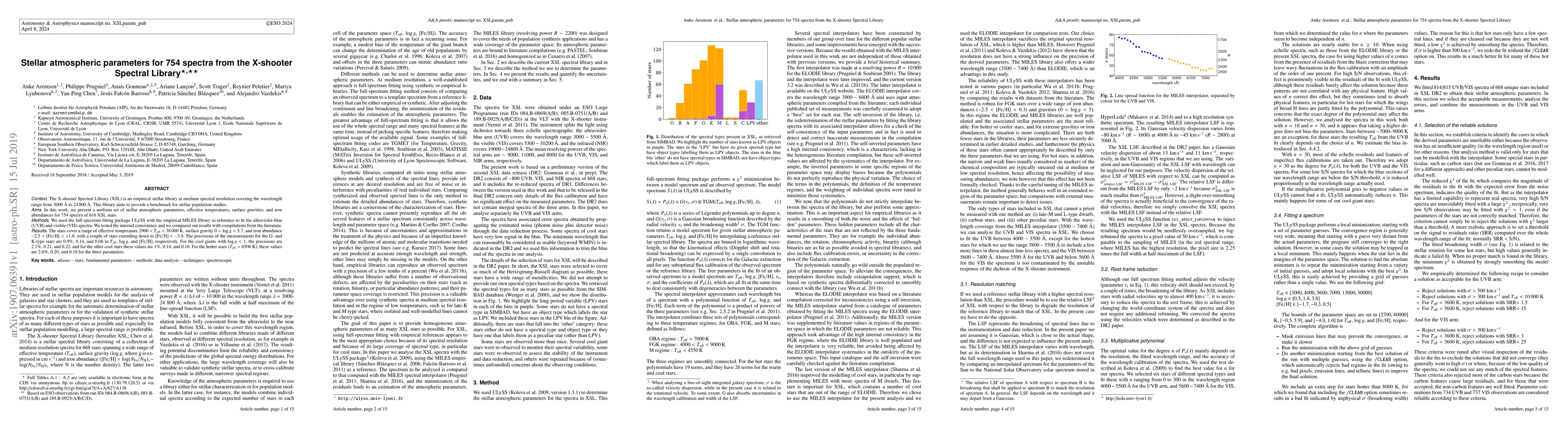 This paper presents a uniform set of stellar atmospheric parameters for 754 spectra from the X-shooter Spectral Library, using the ULySS fitting package. The study covers a wide range of temperatures, gravities, and iron abundances, with high precision for G- and K-type stars.