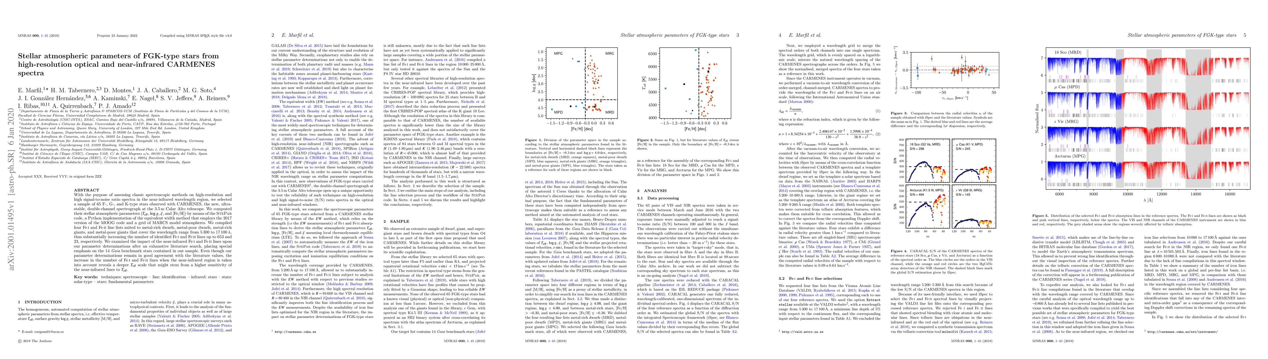 With the purpose of assessing classic spectroscopic methods on high-resolution and high signal-to-noise ratio spectra in the near-infrared wavelength region, we selected a sample of 65 F-, G-, and K-type stars observed with CARMENES, the new, ultra-stable, double-channel spectrograph at the 3.5 m Calar Alto telescope. We computed their stellar atmospheric parameters ($T_{\rm eff}$, $\log{g}$, $\xi$, and [Fe/H]) by means of the StePar code, a Python implementation of the equivalent width method that employs the 2017 version of the MOOG code and a grid of MARCS model atmospheres. We compiled four Fe I and Fe II line lists suited to metal-rich dwarfs, metal-poor dwarfs, metal-rich giants, and metal-poor giants that cover the wavelength range from 5300 to 17100 angstroms, thus substantially increasing the number of identified Fe I and Fe II lines up to 653 and 23, respectively. We examined the impact of the near-infrared Fe I and Fe II lines upon our parameter determinations after an exhaustive literature search, placing special emphasis on the 14 $Gaia$ benchmark stars contained in our sample. Even though our parameter determinations remain in good agreement with the literature values, the increase in the number of Fe I and Fe II lines when the near-infrared region is taken into account reveals a deeper $T_{\rm eff}$ scale that might stem from a higher sensitivity of the near-infrared lines to $T_{\rm eff}$.
