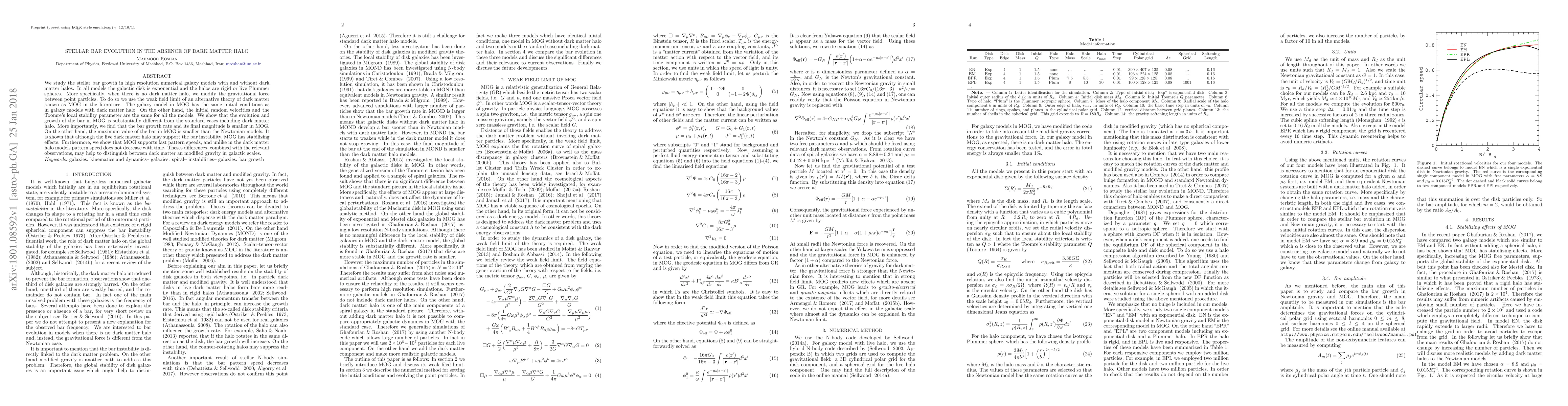 We study the stellar bar growth in high resolution numerical galaxy models with and without dark matter halos. In all models the galactic disk is exponential and the halos are rigid or live Plummer spheres. More specifically, when there is no dark matter halo, we modify the gravitational force between point particles. To do so we use the weak field limit of an alternative theory of dark matter known as MOG in the literature. The galaxy model in MOG has the same initial conditions as in galaxy models with dark matter halo. On the other hand, the initial random velocities and the Toomre's local stability parameter are the same for all the models. We show that the evolution and growth of the bar in MOG is substantially different from the standard cases including dark matter halo. More importantly, we find that the bar growth rate and its final magnitude is smaller in MOG. On the other hand, the maximum value of the bar in MOG is smaller than the Newtonian models. It is shown that although the live dark matter halo may support the bar instability, MOG has stabilizing effects. Furthermore, we show that MOG supports fast pattern speeds, and unlike in the dark matter halo models pattern speed does not decrease with time. Theses differences, combined with the relevant observations, may help to distinguish between dark matter an modified gravity in galactic scales.