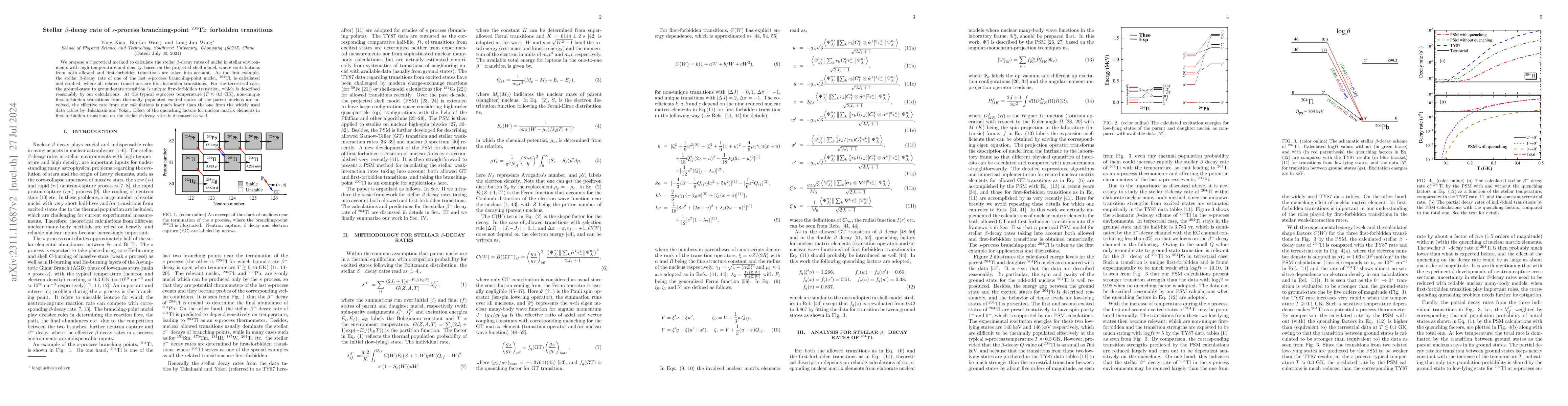 This paper proposes a theoretical method using the projected shell model to calculate stellar $\beta$-decay rates, including first-forbidden transitions, and applies it to the $s$-process branching-point nucleus $^{204}$Tl. The calculated decay rate at typical $s$-process temperatures is significantly lower than previously used values, highlighting the importance of quenching factors in first-forbidden transitions.