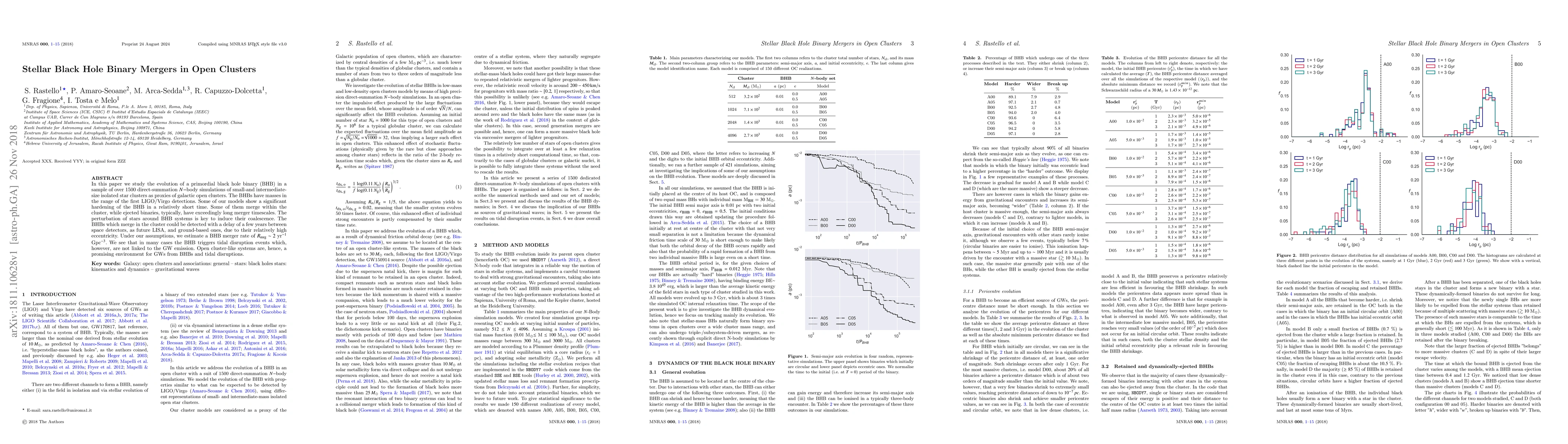 In this paper we study the evolution of a primordial black hole binary (BHB) in a sample of over 1500 direct-summation $N-$body simulations of small-and intermediate-size isolated star clusters as proxies of galactic open clusters. The BHBs have masses in the range of the first LIGO/Virgo detections. Some of our models show a significant hardening of the BHB in a relatively short time. Some of them merge within the cluster, while ejected binaries, typically, have exceedingly long merger timescales. The perturbation of stars around BHB systems is key to induce their coalescence. The BHBs which merge in the cluster could be detected with a delay of a few years between space detectors, as future LISA, and ground-based ones, due to their relatively high eccentricity. Under our assumptions, we estimate a BHB merger rate of $R_{\rm mrg} \sim 2$ yr$^{-1}$ Gpc$^{-3}$. We see that in many cases the BHB triggers tidal disruption events which, however, are not linked to the GW emission. Open cluster-like systems are, hence, a promising environment for GWs from BHBs and tidal disruptions.
