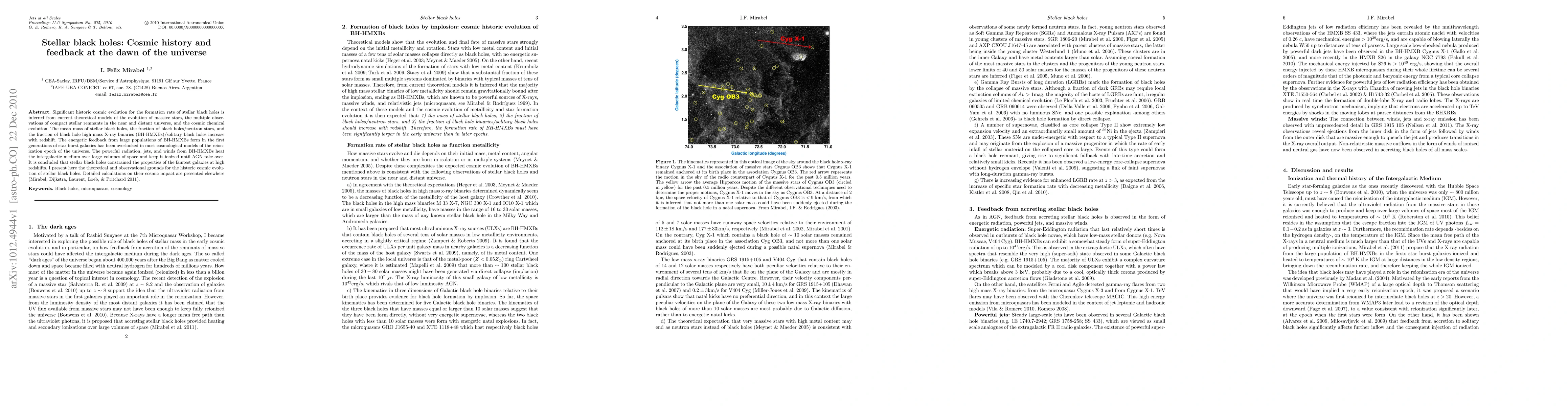 Significant historic cosmic evolution for the formation rate of stellar black holes is inferred from current theoretical models of the evolution of massive stars, the multiple observations of compact stellar remnants in the near and distant universe, and the cosmic chemical evolution. The mean mass of stellar black holes, the fraction of black holes/neutron stars, and the fraction of black hole high mass X-ray binaries (BH-HMXBs)/solitary black holes increase with redshift. The energetic feedback from large populations of BH-HMXBs form in the first generations of star burst galaxies has been overlooked in most cosmological models of the reionization epoch of the universe. The powerful radiation, jets, and winds from BH-HMXBs heat the intergalactic medium over large volumes of space and keep it ionized until AGN take over. It is concluded that stellar black holes constrained the properties of the faintest galaxies at high redshifts. I present here the theoretical and observational grounds for the historic cosmic evolution of stellar black holes. Detailed calculations on their cosmic impact are presented elsewhere (Mirabel, Dijkstra, Laurent, Loeb, Pritchard, 2011).