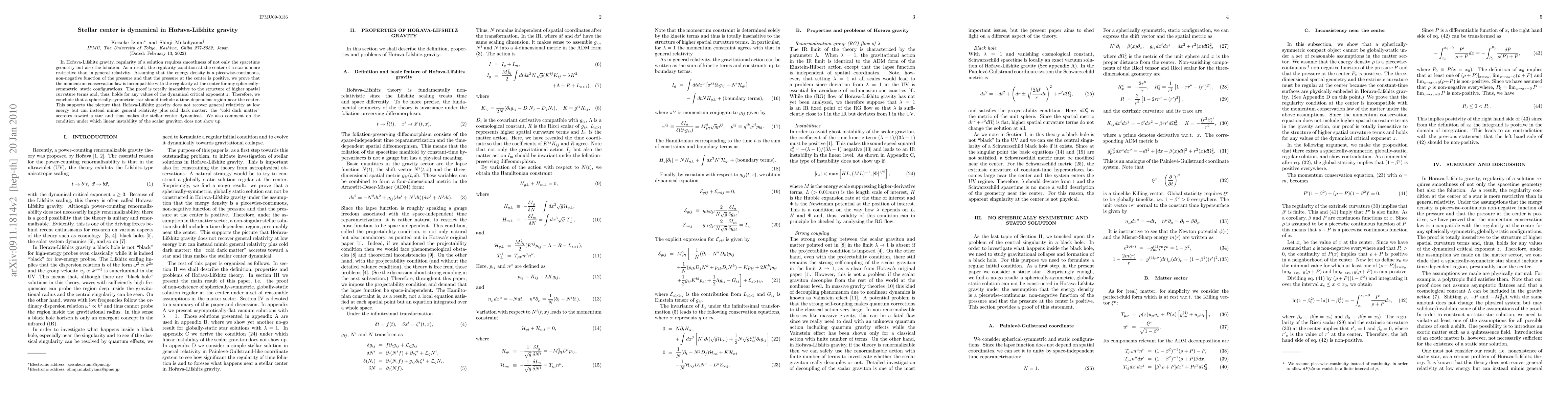 In Horava-Lifshitz gravity, regularity of a solution requires smoothness of not only the spacetime geometry but also the foliation. As a result, the regularity condition at the center of a star is more restrictive than in general relativity. Assuming that the energy density is a piecewise-continuous, non-negative function of the pressure and that the pressure at the center is positive, we prove that the momentum conservation law is incompatible with the regularity at the center for any spherically-symmetric, static configurations. The proof is totally insensitive to the structure of higher spatial curvature terms and, thus, holds for any values of the dynamical critical exponent $z$. Therefore, we conclude that a spherically-symmetric star should include a time-dependent region near the center. We also comment on the condition under which linear instability of the scalar graviton does not show up.