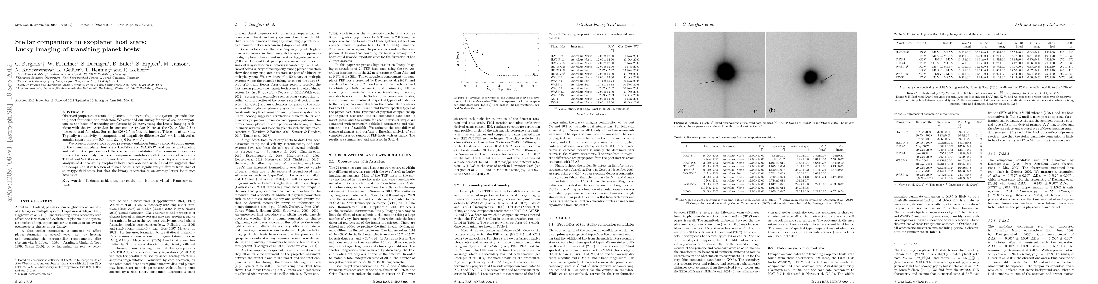 This study uses Lucky Imaging to survey stellar companions of transiting exoplanet host stars, revealing two new binary candidates for HAT-P-8 and WASP-12. The analysis suggests that while exoplanet host stars have a similar companion star fraction as solar-type stars, their binary separations tend to be larger on average.