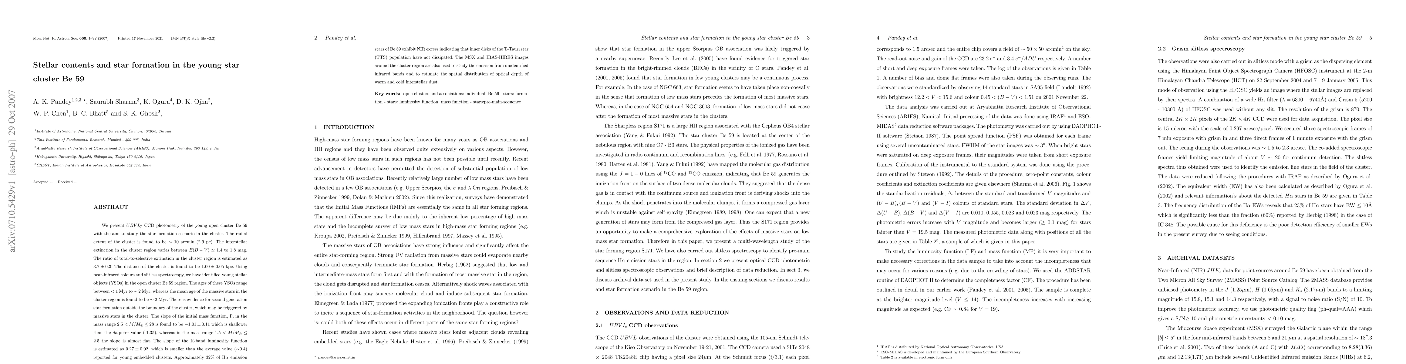 We present $UBVI_C$ CCD photometry of the young open cluster Be 59 with the aim to study the star formation scenario in the cluster. The radial extent of the cluster is found to be $\sim$ 10 arcmin (2.9 pc). The interstellar extinction in the cluster region varies between $E(B-V) \simeq$ 1.4 to 1.8 mag. The ratio of total-to-selective extinction in the cluster region is estimated as $3.7\pm0.3$. The distance of the cluster is found to be $1.00\pm0.05$ kpc. Using near-infrared colours and slitless spectroscopy, we have identified young stellar objects (YSOs) in the open cluster Be 59 region. The ages of these YSOs range between $<1$ Myr to $\sim$ 2 Myr, whereas the mean age of the massive stars in the cluster region is found to be $\sim$ 2 Myr. There is evidence for second generation star formation outside the boundary of the cluster, which may be triggered by massive stars in the cluster. The slope of the initial mass function, $\Gamma$, in the mass range $2.5 < M/M_\odot \le 28$ is found to be $-1.01\pm0.11$ which is shallower than the Salpeter value (-1.35), whereas in the mass range $1.5 < M/M_\odot \le 2.5$ the slope is almost flat. The slope of the K-band luminosity function is estimated as $0.27\pm0.02$, which is smaller than the average value ($\sim$0.4) reported for young embedded clusters. Approximately 32% of H$\alpha$ emission stars of Be 59 exhibit NIR excess indicating that inner disks of the T-Tauri star (TTS) population have not dissipated. The MSX and IRAS-HIRES images around the cluster region are also used to study the emission from unidentified infrared bands and to estimate the spatial distribution of optical depth of warm and cold interstellar dust.