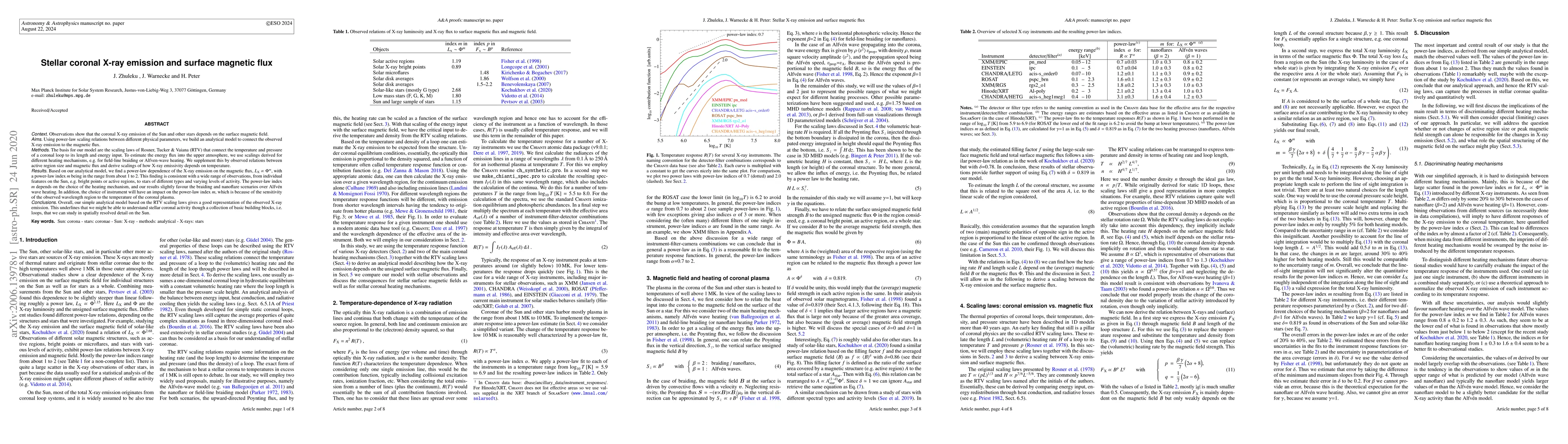 Observations show that the coronal X-ray emission of the Sun and other stars depends on the surface magnetic field. Using power-law scaling relations between different physical parameters, we build an analytical model to connect the observed X-ray emission to the magnetic flux. The basis for our model are the scaling laws of Rosner, Tucker \& Vaiana (RTV) that connect the temperature and pressure of a coronal loop to its length and energy input. To estimate the energy flux into the upper atmosphere, we use scalings derived for different heating mechanisms, e.g. for field-line braiding or Alfven-wave heating. We supplement this by observed relations between active region size and magnetic flux and derive scalings of how X-ray emissivity depends on temperature. Based on our analytical model, we find a power-law dependence of the X-ray emission on the magnetic flux, $L_{\rm X}\propto \Phi^m$, with a power-law index $m$ being in the range from about 1 to 2. This finding is consistent with a wide range of observations, from individual features on the Sun, e.g. bright points or active regions, to stars of different types and varying levels of activity. The power-law index $m$ depends on the choice of the heating mechanism, and our results slightly favour the braiding and nanoflare scenarios over Alfv\'en wave heating. In addition, the choice of instrument will have an impact on the power-law index $m$, which is because of the sensitivity of the observed wavelength region to the temperature of the coronal plasma. Overall, our simple analytical model based on the RTV scaling laws gives a good representation of the observed X-ray emission. This underlines that we might be able to understand stellar coronal activity though a collection of basic building blocks, i.e. loops, that we can study in spatially resolved detail on the Sun.