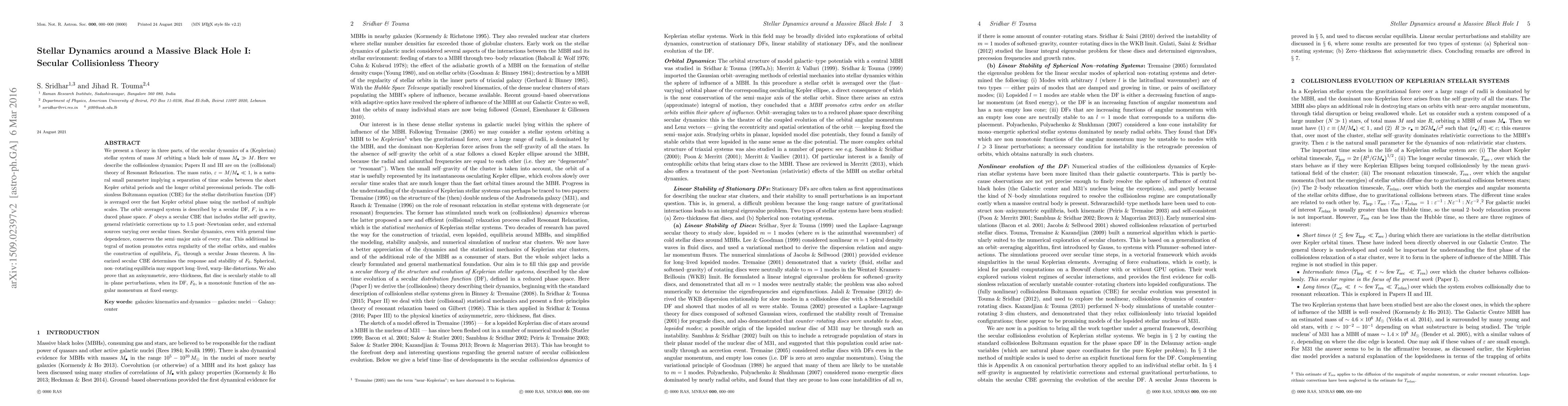 This paper develops a theory for the secular collisionless dynamics of a Keplerian stellar system orbiting a massive black hole, focusing on the averaged collisionless Boltzmann equation. It demonstrates that secular dynamics conserves the semi-major axis of stars, leading to stable equilibria and the stability of axisymmetric, flat discs under certain conditions.