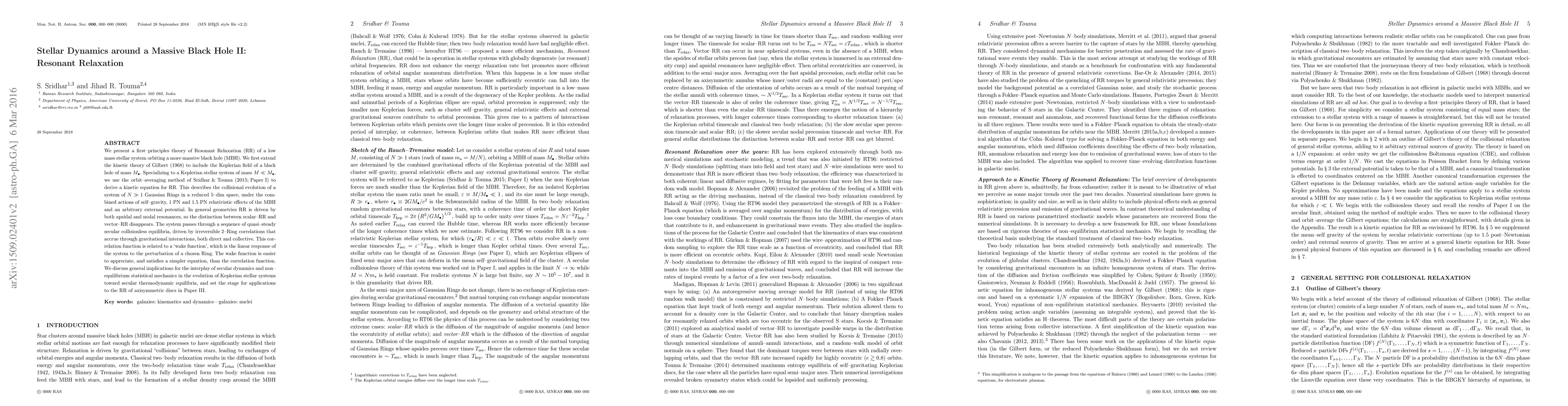 This paper develops a first-principles theory of Resonant Relaxation around a massive black hole, extending Gilbert's kinetic theory to include relativistic effects. It derives a kinetic equation describing the evolution of stellar systems through gravitational interactions, highlighting the role of apsidal and nodal resonances in driving secular dynamics.