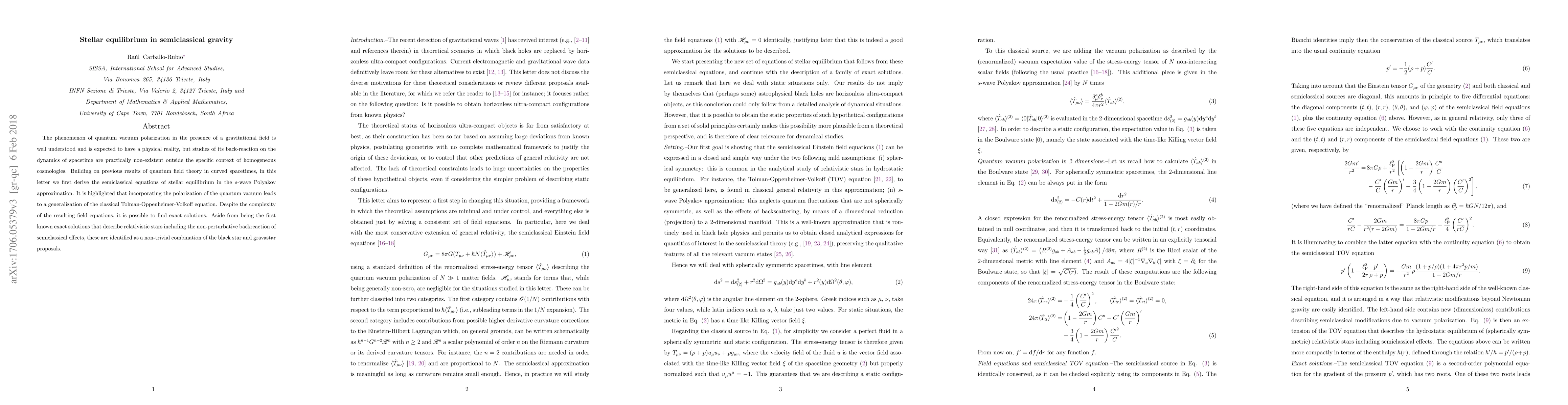 The phenomenon of quantum vacuum polarization in the presence of a gravitational field is well understood and is expected to have a physical reality, but studies of its back-reaction on the dynamics of spacetime are practically non-existent outside the specific context of homogeneous cosmologies. Building on previous results of quantum field theory in curved spacetimes, in this letter we first derive the semiclassical equations of stellar equilibrium in the s-wave Polyakov approximation. It is highlighted that incorporating the polarization of the quantum vacuum leads to a generalization of the classical Tolman-Oppenheimer-Volkoff equation. Despite the complexity of the resulting field equations, it is possible to find exact solutions. Aside from being the first known exact solutions that describe relativistic stars including the non-perturbative backreaction of semiclassical effects, these are identified as a non-trivial combination of the black star and gravastar proposals.