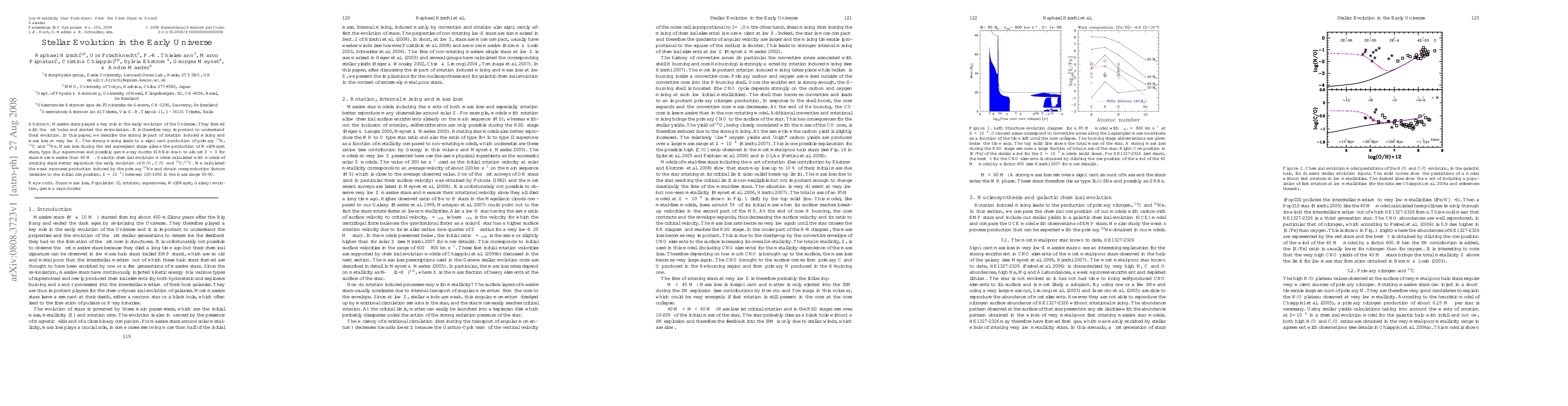 This paper investigates the evolution of massive stars in the early Universe, emphasizing the effects of rotation-induced mixing and mass loss. It finds that these processes significantly produce primary nitrogen, carbon, and neon isotopes, and lead to the formation of Wolf-Rayet stars and supernovae, impacting galactic chemical evolution models.