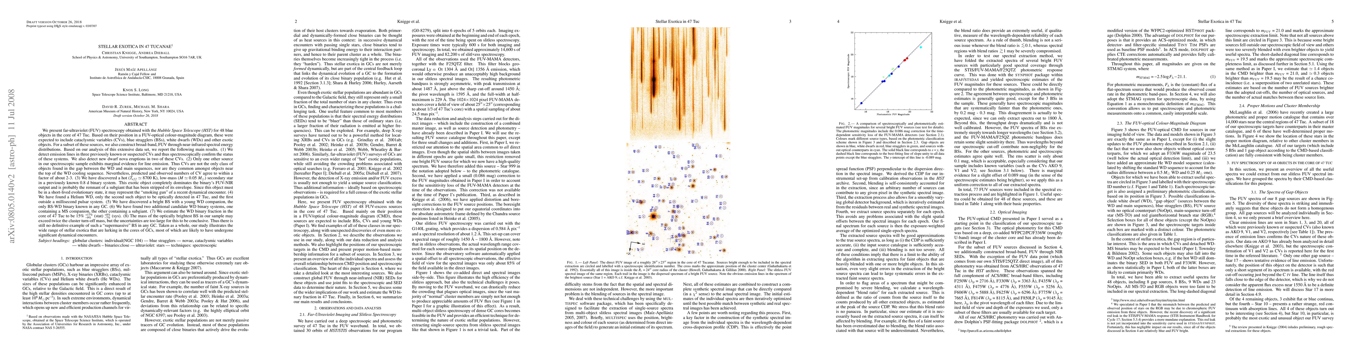 We present far-UV spectroscopy obtained with HST for 48 blue objects in the core of 47 Tuc. Based on their position in a FUV-optical colour-magnitude diagram, these were expected to include cataclysmic variables (CVs), blue stragglers (BSs), white dwarfs (WDs) and other exotic objects. For a subset of these sources, we also construct FUV-NIR SEDs. Based on our analysis of this extensive data set, we report the following main results. (1) We spectroscopically confirm 3 previously known or suspected CVs via the detection of emission lines and find new evidence for dwarf nova eruptions in two of these. (2) Only one other source in our spectroscopic sample exhibits marginal evidence for line emission, but predicted and observed CV numbers still agree to within a factor of about 2-3. (3) We have discovered a hot (T_eff = 8700 K), low-mass (M = 0.05 M_sun) secondary star in a previously known 0.8 day binary system. This exotic object is probably the remnant of a subgiant that has been stripped of its envelope and may represent the ``smoking gun'' of a recent dynamical encounter. (4) We have found a Helium WD, the second to be optically detected in 47 Tuc, and the first outside a millisecond-pulsar system. (5) We have discovered a BS-WD binary system, the first known in any globular cluster. (6) We have found two additional candidate WD binary systems with putative main sequence and subgiant companions. (7) We estimate the WD binary fraction in the core of 47 Tuc to be 15 +17/-9 (stat) +8/-7 (sys). (8) One BS in our sample may exceed twice the cluster turn-off mass, but the uncertainties are large. Taken as a whole, our study illustrates the wide range of stellar exotica that are lurking in the cores of GCs, most of which are likely to have undergone significant dynamical encounters. [abridged]