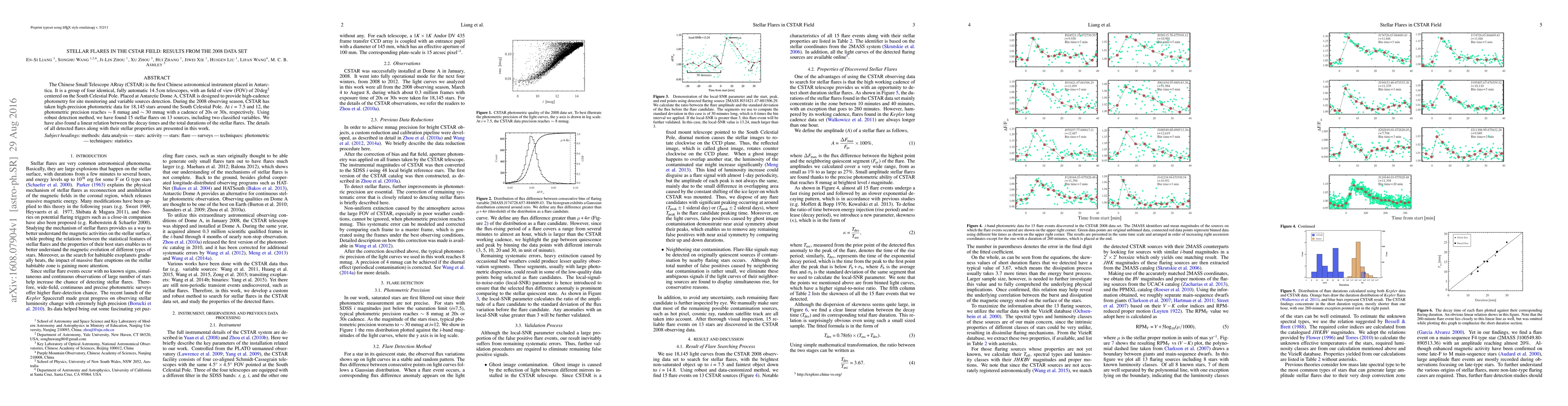 The Chinese Small Telescope ARray (CSTAR) is the first Chinese astronomical instrument placed in Antarctica. It is a group of four identical, fully automatic $14.5\,\rm{cm}$ telescopes, with an field of view (FOV) of $20\,\rm{deg^2}$ centered on the South Celestial Pole. Placed at Antarctic Dome A, CSTAR is designed to provide high-cadence photometry for site monitoring and variable sources detection. During the 2008 observing season, CSTAR has taken high-precision photometric data for 18,145 stars around the South Celestial Pole. At $i\,=\,7.5$ and $12$, the photometric precision reaches $\sim 8$ mmag and $\sim 30$ mmag with a cadence of 20s or 30s, respectively. Using robust detection method, we have found 15 stellar flares on 13 sources, including two classified variables. We have also found a linear relation between the decay times and the total durations of the stellar flares. The details of all detected flares along with their stellar properties are presented in this work.